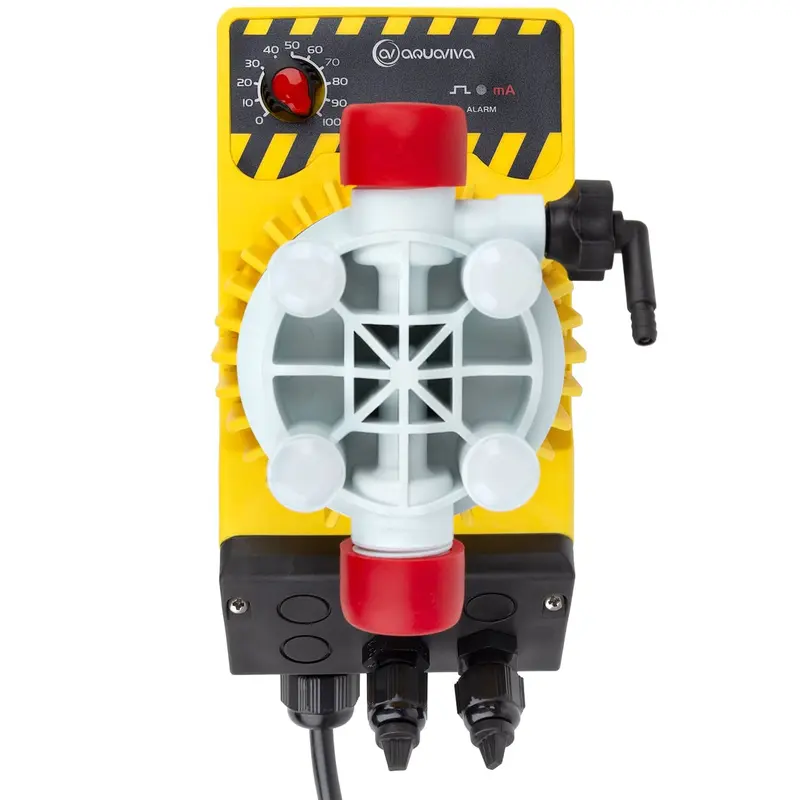 Дозувальний насос Aquaviva AMM200 - оптимальне рішення для дозування рідких реагентів у сфері обслуговування технічних конструкцій (басейни, аквапарки, виробництва), методом пропорційного дозування. Має цифровий блок мікропроцесорного управління дозування рідких реагентів. Принцип дії пристрою базується на обертанні соленоїдної котушки, що впливає на діафрагму, яка, в свою чергу, виштовхує рідину через головку насоса. Серія насосів Aquaviva AMM використовує високоякісні діафрагми PTFE. Дозування здійснюється пропорційно, з можливістю налаштування швидкості. Продуктивність: від 0.1 до 14 л/год (в залежності від тиску в системі трубопроводу)Допустимий тиск в системі трубопроводу: від 1 до 10 Bar