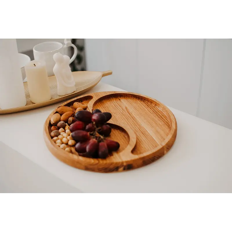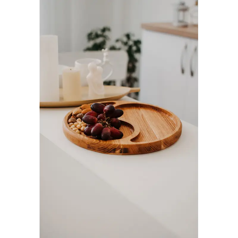 Опис Дошка менажниця з дуба поєднує природню міцність та функціональність. Кругла форма тарілки надає їй вишуканого вигляду, а діаметр 30 см створює достатньо простору для різноманітних закусок. Товщина 2,5 см та глибина 1 см забезпечують надійність та стійкість конструкції.Дошка оброблена соняшниковою олією, що надає їй натуральний блиск і зберігає природну текстуру деревини. Це не тільки надає гарний зовнішній вигляд, а й служить захисним покриттям, продовжуючи термін служби виробу.Секції різних розмірів на дошці дозволяють організувати презентацію закусок та соусів з вишуканістю та стилем, роблячи сервірування столу ще більш привабливим.