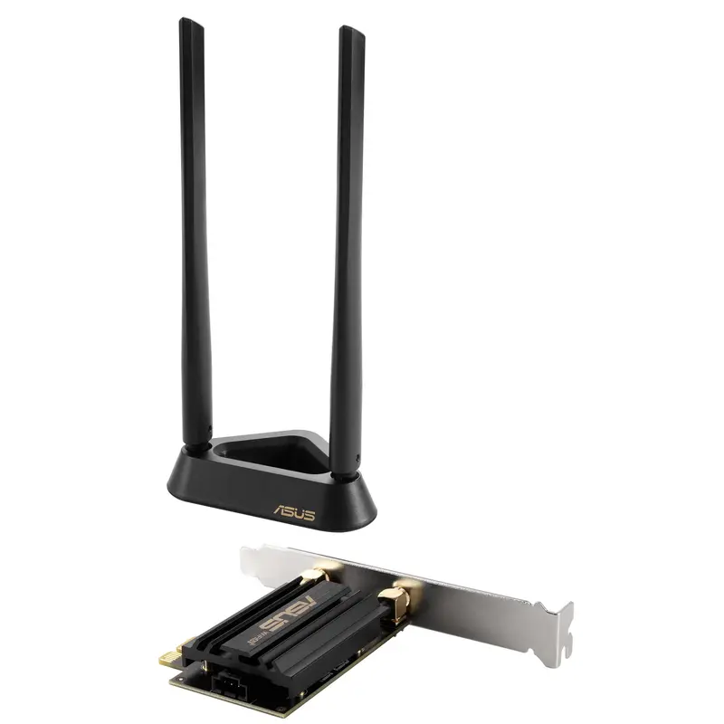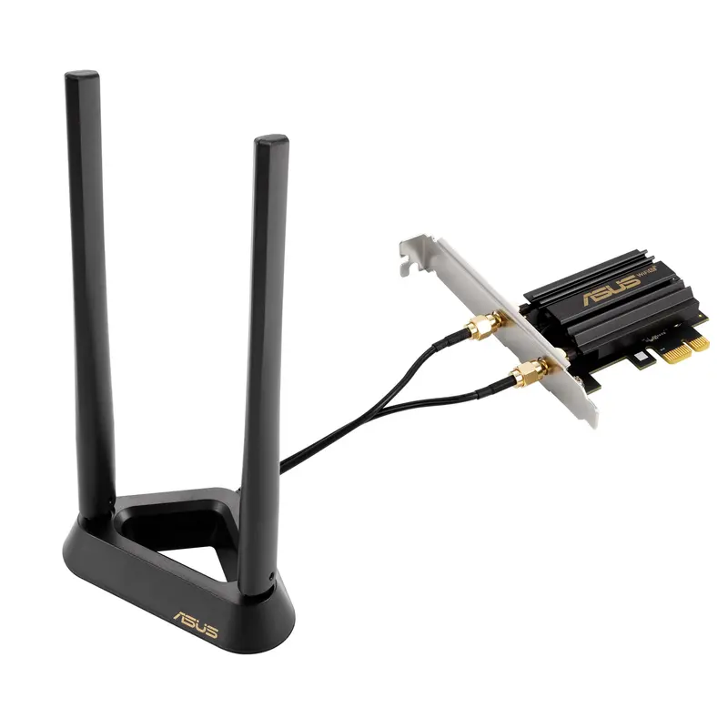 ASUS пропонує комплексне рішення для розгортання мережі нового стандарту WiFi 6E, до складу якого входять маршрутизатори та бездротові адаптери з інтерфейсом PCIe. Завдяки ретельно розробленому апаратному та програмному забезпеченню рішення ASUS Wi-Fi 6E забезпечує високу продуктивність та широкі функціональні можливості. ASUS PCE-AXE59BT – це адаптер стандарту Wi-Fi 6 у вигляді карти PCIe, що дає змогу комп’ютеру підключатися до маршрутизатора Wi-Fi 6E через виділений діапазон 6 ГГц. Це означає, що він не буде конкурувати за смугу пропускання з пристроями без підтримки Wi-Fi 6E. Діапазон 6 ГГц забезпечує до семи додаткових каналів 160 МГц, щоб збільшити пропускну здатність і надати більшу гнучкість у використанні найменш перевантажених радіоканалів. Швидкий апгрейд до стандарту Wi‑Fi 6E. Завдяки технології Wi-Fi 6E 6 ГГц і широким радіоканалам (160 МГц) адаптер PCE-AXE59BT забезпечує швидкість бездротового зв’язку, яка в 4,6 раза перевищує швидкість пристроїв стандарту Wi-Fi 5. Це ідеальний вибір для завдань, що потребують найбільшої пропускної здатності мережевого з’єднання. Мінімальна затримка. Швидкий Wi-Fi. Адаптер PCE-AXE59BT підтримує технології OFDMA і MU-MIMO, які забезпечують підвищену швидкість передачі даних, коли бездротовому маршрутизатору доводиться обслуговувати велику кількість клієнтських пристроїв одночасно. Миттєвий апгрейд Bluetooth Крім Wi-Fi, адаптер PCE-AXE59BT дозволяє наділити комп’ютер інтерфейсом Bluetooth®, призначеним для бездротового підключення периферійних пристроїв. Інтерфейс представлений новітньою версією 5.2, яка відзначається у два рази вищою швидкістю передачі даних і в чотири рази більшим діапазоном дії в порівнянні з Bluetooth 4.2. Версія Bluetooth 5.2 також має кращий захист від перешкод у порівнянні з Bluetooth 5.0. Оптимальне розміщення антен – стабільний сигнал Wi-Fi. Зовнішній приймально-передавальний модуль адаптера PCE-AXE59BT дозволяє розмістити антени зовні комп’ютерного корпусу й налаштувати їх кут нахилу таким чином, щоб мінімізувати завади та посилити бездротовий сигнал. Магнітна основа забезпечує гнучке розміщення. Покращений захист мережевого з'єднання з WPA3. PCE-AXE59BT підтримує протокол безпеки WPA3, який додає ще один рівень захисту комп’ютера від зовнішніх атак.