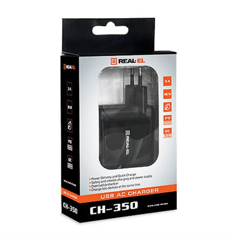 Зарядний USB-пристрій REAL-EL CH-350 підтримує протоколи Power Delivery 27W та Quick Charge 3.0 і призначений для заряджання акумуляторів портативних пристроїв (мобільних телефонів, смартфонів, MP3-плеєрів, КПК, планшетних комп"ютерів та інших цифрових пристроїв) та живлення портативної акустики від побутової електромережі.