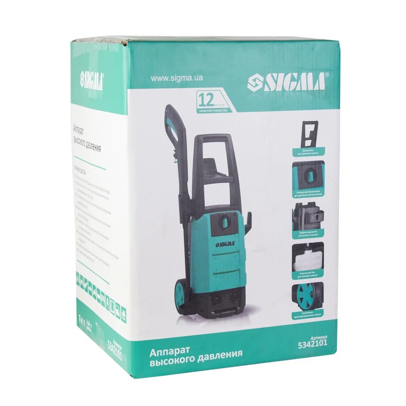Мийка 2000Вт max 150bar 7,2 л/хв + турбонасадка Sigma 5342101 призначена для миття різних транспортних засобів (велосипедів, мотоциклів, автомобілів та їх двигунів), садового інвентарю, тротуарної та фасадної плитки, садових доріжок, фасадів будівель, а також для прочищення дощових зливів із застосуванням чистої води та хімічних миючих засобів. Корпус мийки виконаний з якісного пластику, здатним тривалий час протистояти агресивному впливу навколишнього середовища. Переміщення мийки допомагає зручна і міцна рукоять, а також пара коліс у нижній частині корпусу. Переваги: Зручна і ергономічна ручка для транспортування; Обмотки статора електродвигуна виготовлені з міді; Вбудована термічна захист електродвигуна; Насосна частина виконана з легкосплавних металів з антикорозійним покриттям; Три плунжера насосної частини виготовлені із загартованої нержавіючої сталі; Мийка оснащена системою автоматичного відключення при досягненні граничного тиску в камері насоса; Можливість забору води з ємностей (резервуарів) або відкритих водойм; Зміна форми струменя за допомогою поворотної втулки на форсунці; Оптимальна комплектація. Купити мийку високого тиску Sigma Ви можете, оформивши замовлення в нашому інтернет-магазині за допомогою простої форми, доставка здійснюється по всій Україні. Якщо у Вас виникли питання, Ви можете зателефонувати за вказаними номерами телефонів або замовити зворотній дзвінок. Фахівці нашого інтернет-магазину нададуть Вам докладні консультації та допоможуть зробити правильний вибір. ПАРАМЕТРИ: Артикул : 5342101Потужність, Вт : 2000Максимальна продуктивність, л/хв : 7.2Тип : Мийка високого тискуНапруга, В : 220Частота, Гц : 50Тема форуму для коментарів : 75Кількість коментарів до елемента : 1Максимальна температура перекачується рідини, °C : 40Маса, кг : 10.9Довжина шлангу, м : 5.5Максимальний тиск, бар : 150Офіційна гарантія Від виробника