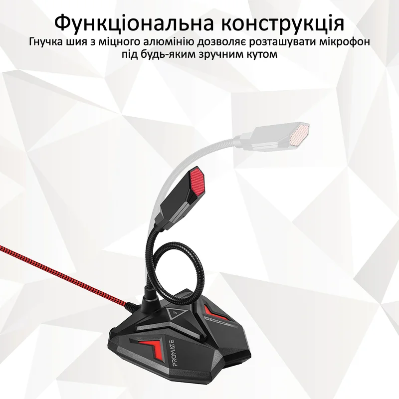 Promate Streamer - універсальний мікрофон для домашнього використання, відмінно підійде для ігрового стримера, геймера або професійного ютубера. Особливості: Якісний звукозапис: Вбудований аудіофільтр забезпечує чітку та чисту передачу голосу без шумів і перешкод. Функціональна конструкція: Гнучка шия з міцного алюмінію дозволяє розташувати мікрофон під будь-яким зручним кутом. Геймерський дизайн: Агресивні форми й елементи з металу підкреслюють характер ґаджета. LED підсвітка: Відтворить ігрову атмосферу й налаштує тебе на перемогу. Керуй підсвіткою за допомогою вбудованого перемикача. Роз'єм 3.5 мм (AUX): Підключай свої навушники безпосередньо через Streamer. Кнопка Mute: Вимикай звук на мікрофоні одним натисканням. Plug&Play: Windows або Mac OS і ніякого додаткового ПЗ, тобі потрібен тільки вільний USB порт. Універсальна сумісність: Працює з більшістю комп'ютерних програм для обробки та запису звуку.