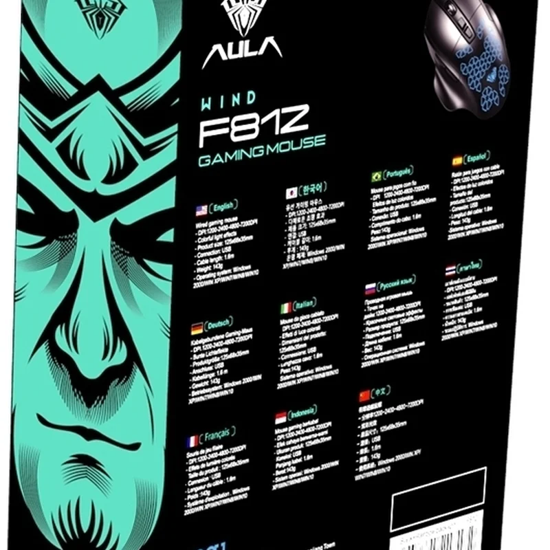 Це надзручна дротова ігрова комп'ютерна миша USB з 7 кнопками управління і точністю управління мишею від 1200 до 7200 точок на дюйм. F812 має програмовані кнопки макросів. Оптичний датчик F812 забезпечує 4000 кадрів на секунду і 40 кадрів на секунду. Ця серія має спеціально розроблену форму, яка забезпечує антивтомлюваність руки та дає змогу грати в ігри протягом тривалого часу без втоми рук. Завдяки новітній технології розроблення AULA кожну ігрову комп'ютерну мишу серії F812 розроблено з використанням технології комфортного кліка з терміном експлуатації до 20000000, а також вона має додаткові бічні кнопки та додаткові кнопки з регульованою функцією. Ігрову мишу серії F812 оснащено якісним міцним кабелем, що забезпечує комфортне використання і довгий термін служби. Серія F812 має 7-ступінчасте підсвічування AULA Ambiglow, що робить цю модель унікальною, а її застосовність особливо стильною в темний час доби! Ігрові миші серії F812 актуальні як для комп'ютерних ігор, так і для домашнього використання завдяки універсальній класичній формі. F812 - міцний плетений шнур.