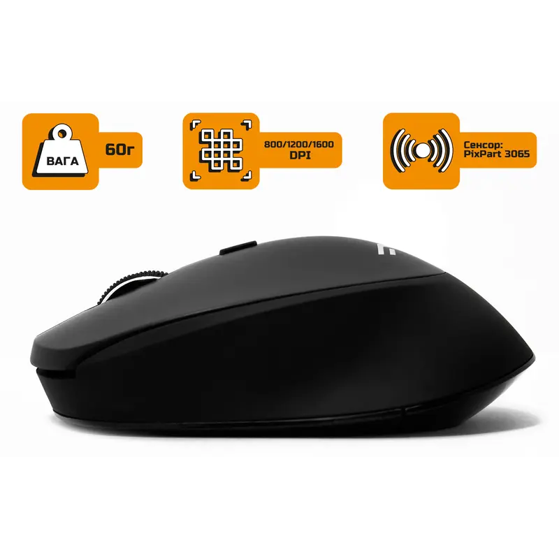 Бездротова миша Frime FWMO-300 Wireless Black має класичну форму з перемикачем роздільной здатності. Верхня панель маніпулятора виконана з приємного на дотик софттач пластику.