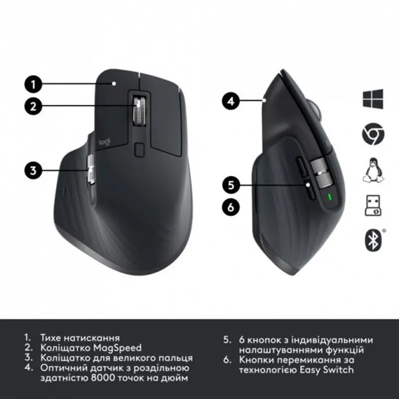 MX Master 3S for Business - високопродуктивна миша зручної форми з покращеною роздільною здатністю 8000 DPI та технологією Quiet Click. Серія MX ідеально підходить для спеціалізованих робочих процесів, таких як кодування та творчість. Продукти серії MX виготовлені з міцних якісних матеріалів та створені для того, щоб вселяти довіру та підвищувати концентрацію на роботі.