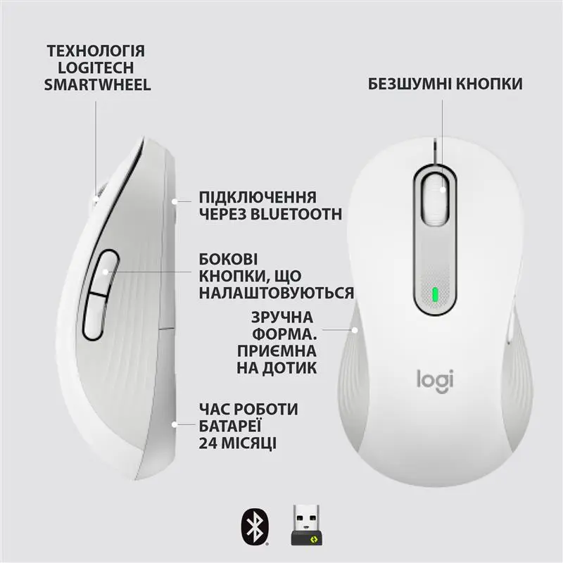 Розумне прокручування. Зручне захоплення. Ви можете настроїти прокручування під цілі. Прокручуйте документ рядками, якщо потрібно зосередитися на деталях, або використовуйте плавне прокручування, якщо потрібно перегорнути велику кількість сторінок. Автоматично перемикайте режими одним натисканням. Комфорт нового рівня Вам подобається працювати з мишею Signature M650. Насолоджуйтеся зручним та природним положенням руки завдяки ергономічній формі, м’якій зоні під великим пальцем та гумовим боковим накладкам. Забудьте про незручності та зосередьтеся на своїх завданнях. Декілька способів приєднання. Робота на багатьох платформах Миттєве приєднання за допомогою технології Bluetooth Low Energy або через USB-приймач Logi Bolt. Надійне та стабільне під’єднання в радіусі до 10 метрів. Миші Signature M650 працюють на безлічі платформ: Windows, MacOS, Linux, iPadOS, Android, а також мають сертифікат Works With Chromebook. Менше шуму, більше діла Більше жодних дратівливих клацань. Унікальна технологія Logitech SilentTouch на 90% знижує рівень гучності під час введення тексту та клацання лівою кнопкою миші, підтримуючи приємну та тиху атмосферу для вас та оточення. Налаштовувані бічні кнопки Технологія Logitech Options+ дає змогу призначати на бічні кнопки улюблені клавіші в Windows і macOS (наприклад, назад і вперед або копіювати та вставити). Час роботи батареї — 24 місяці До комплекту миші Signature M650 входить батарейка типу AA, якої вистачить майже на два роки роботи. Зосередьтеся на роботі та не турбуйтеся про рівень заряду. (Час роботи батареї залежить від режиму експлуатації та використовуваного комп’ютера) Виготовлений із застосуванням переробленого пластику Пластмасові деталі миші Signature M650 містять пластик, що складається із вторинних матеріалів. Так компанія підтримує вторинне перероблення та знижує обсяги викидів вуглекислого газу в довкілля.