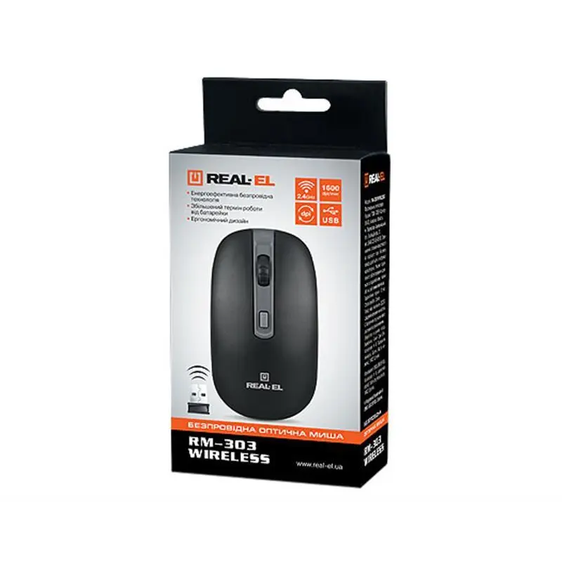 Енергоефективна бездротова технологія дає змогу маніпулятору Real-El RM-301 Wireless працювати практично на будь-якій поверхні.Особливості:Енергоефективна бездротова технологіяЕргономічний дизайнКнопка перемикання роздільної здатності DPIРоздільна здатність - 800/1200/1600 dpiЖивлення від батарейки типу AА