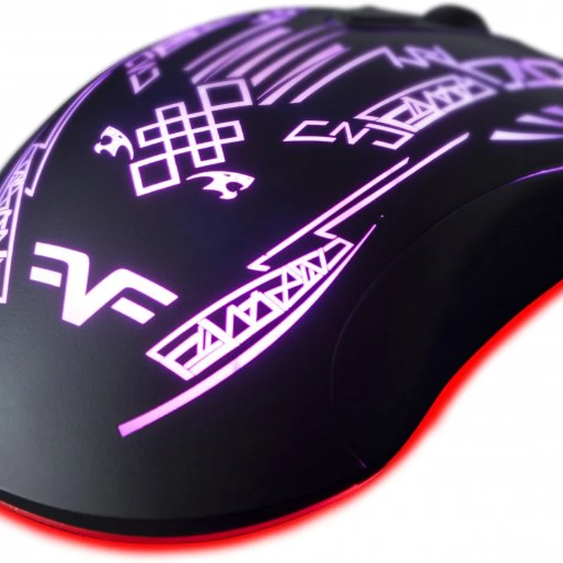 Ігрова миша Frime Black Panther має класичну симетричну форму без додаткових кнопок. Підійде як під хватку "долоню", так і під хватку "пальці". Оснащена оптичним датчиком Pixart ADNS-3050, перемикачами Omron на 20 мільйонів натиснень і кабелем в тканинної оплітці з ферітовим фільтром, довгою 210 см. Кабель захищений від перегину біля основи миші, а також має позолочений USB коннектор. Верхня панель маніпулятора виконана з приємного на відчули софттач пластика матового кольору з ілюмінують малюнком.