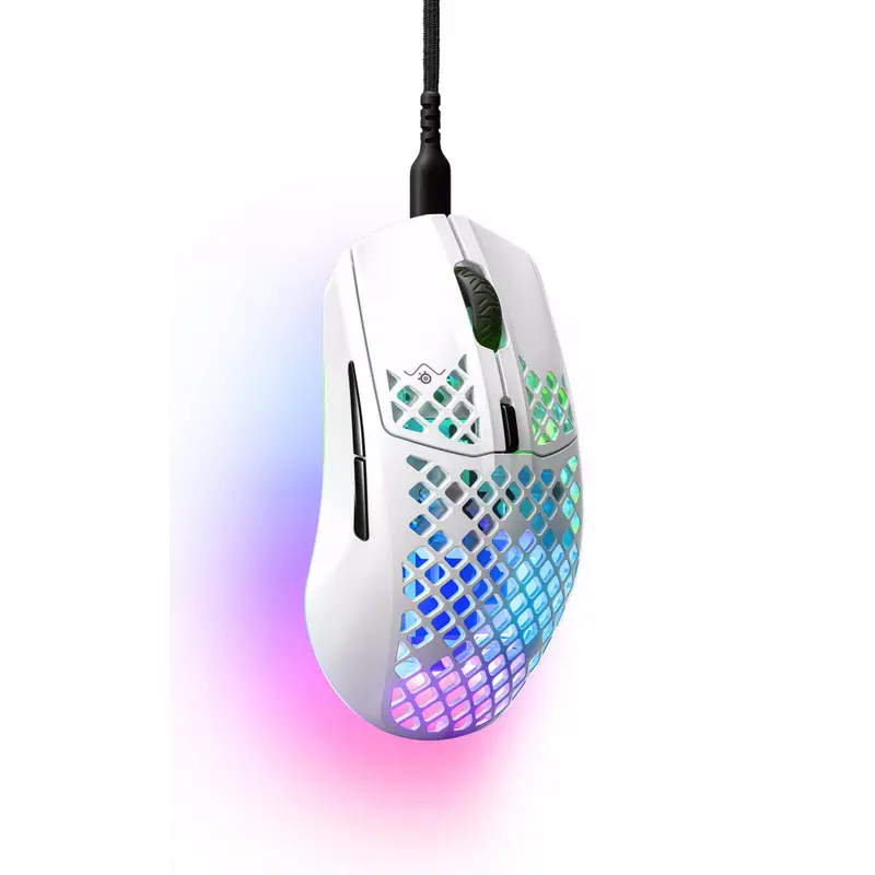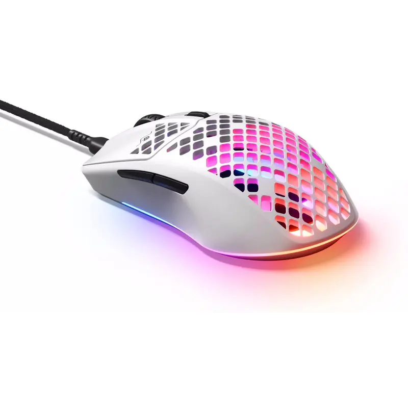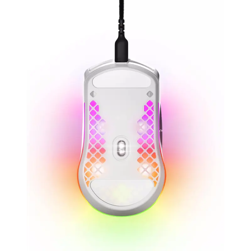 Steelseries Aeros 3 USB - сучасна і надійна провідна мишка для завзятих геймерів. Призначена для користування правою рукою. Вона обладнана чутливим сенсором TrueMove Core, роздільна здатність якого становить від 200 до 8500 dpi (змінюється з кроком в 100 dpi). Її надлегка ергономічна конструкція дозволяє реагувати і рухатися під час гри максимально швидко і точно. До того ж перфорований корпус мишки не тільки полегшує її, але і дозволяє руці не пітніти під час гарячих сутичок. Пристрій одержав захист від вологи і пилу IP54. А тефлонові ніжки забезпечать комфортне і легке ковзання для зручності користування. Підключається виріб за допомогою кабелю USB-C, що має гнучким і водночас міцним. Дизайн пристрою стильний, має матове біле покриття і 3 незалежні зони RGB-підсвічування. З такою мишкою гравець буде впевнено вести свою команду до перемоги!
