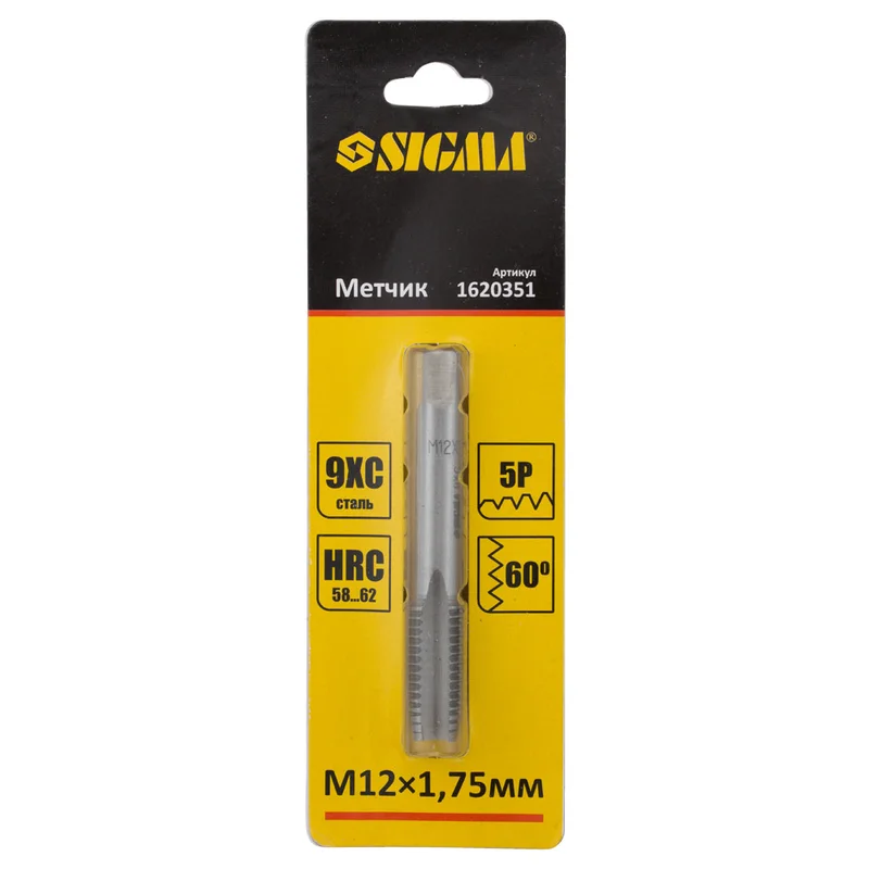 Мітчик М12×1.75мм SIGMA (1620351) призначений для нарізування внутрішніх різьблень. Являє собою гвинт з прорізаними стружковими канавками, що утворюють ріжучі кромки. Хвостовою частиною кріпиться в тримач для мітчиків (комірець), робочою частиною вводиться в отвір, в якому при провертанні тримача зворотно-поступальними рухами нарізається різьба. При нарізанні, різьблення, попередньо, змащують консистентним мастилом.