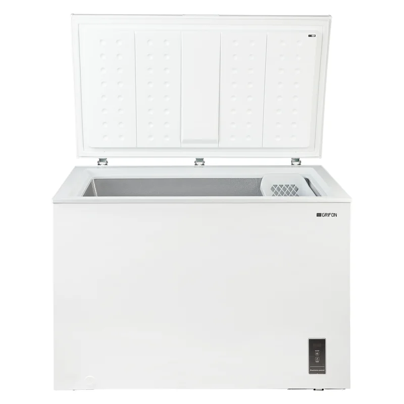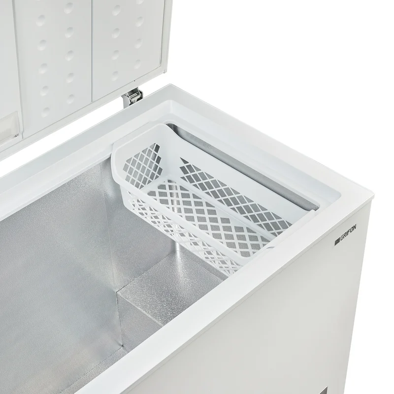 GRIFON – український бренд побутової техніки високої якості, який завжди піклується про комфорт вашого життя. У виробництві ми ретельно контролюємо якість матеріалів для нашої продукції, щоб піклуватися про ваше здоров'я. Техніка GRIFON виготовляється на заводах з багаторічною історією. Весь процес виробництва суворо контролюється, а якість продукції бренду підтверджено сертифікатами Європи та України. ВИРОБНИЦТВО Виробництво ми обираємо за такими критеріями: - висока культура виробництва - використання передових технологій; - лідируючі позиції серед заводів-виробників; - контроль якості на кожному етапі від сировини до готової продукції; - надійність та лояльність до партнерів; - гарантійний супровід. Велика морозильна скриня Grifon GRML-300EI Оптимальне співвідношення доступної ціни та високого рівня якості — це морозильна скриня GRML-300EI від Grifon. Створена з перевірених компонентів для довготривалої служби, вона готова працювати без перебоїв та технічного обслуговування мінімум 10 років. З такою технікою ви маєте змогу заморожувати на тривалий час різні типи продуктів, не хвилюючись про їх збереження місяцями. Зовнішні характеристики Білий колір побутової техніки — практичне рішення з точки зору дизайну та чистоти. Ви можете встановити скриню GRML-300EI на дачі, в магазині чи великій квартирі. Завдяки оптимальним габаритам виробу 1115х645х850 мм, його можна встановити майже будь-де. Кришка герметично закривається, а просте відкриття забезпечує прихована ергономічна ручка. На фасаді розміщений невеликий отвір для ручної розморозки, а також сенсорний термостат з індикаторами процесу заморозки. Можливості розміщення продуктів Глибока та містка морозильна скриня розрахована на об’єм у 290 літрів, де без проблем поміститься зимовий запас продуктів: -овочі; -фрукти; -м’ясо; -риба; -напівфабрикати; -фарш. Комплектація GRML-300EI включає в себе дві залізні навісні корзини для дрібних заморозок — морозива, льоду та іншого. Технічні показники. Скриня GRML-300EI має новітні компоненти системи охолодження — компресор PZ75H1W та холодоагент R600a. Завдяки електронним терморегуляторам, високій теплоізоляції та А++-класу енергоефективності споживання енергії пристрою складає усього 229 кВт на рік. Широкий набір кліматичних класів — N/SN/ST/T, свідчать про те, що морозильна скриня може працювати без перебоїв, коли температура зовні в рамках від +10 до +43 °С. Тобто її можна поставити навіть на літній веранді.