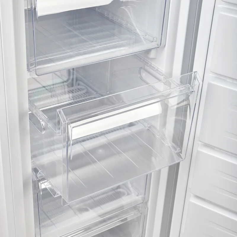 GRIFON – український бренд побутової техніки високої якості, який завжди піклується про комфорт вашого життя. У виробництві ми ретельно контролюємо якість матеріалів для нашої продукції, щоб піклуватися про ваше здоров'я. Техніка GRIFON виготовляється на заводах з багаторічною історією. Весь процес виробництва суворо контролюється, а якість продукції бренду підтверджено сертифікатами Європи та України. ВИРОБНИЦТВО Виробництво ми обираємо за такими критеріями: - висока культура виробництва - використання передових технологій; - лідируючі позиції серед заводів-виробників; - контроль якості на кожному етапі від сировини до готової продукції; - надійність та лояльність до партнерів; - гарантійний супровід. "Грифоновська" морозильна камера з легкістю стане родзинкою будь-якого приміщення - кухні у квартирі або літньої кухні в приватному будинку, наприклад. Колірна гамма DFM-143W максимально універсальна. Вертикальна форма з механічним керуванням дає змогу розмістити в кутовій частині кімнати, а розміри підійдуть навіть для найменшого приміщення: висота - 1,426 м; ширина - 0,544 м; глибина - 0,571 м; вага - 43 кг. Морозилка має реверсивні двері з округлими кутами, що дає змогу стильно виглядати в загальному інтер'єрі. Дверна панель і зовнішня поверхня виконані з металу, а пластмасова ручка надійно захована від сторонніх очей. 2 регулювальні ніжки та 2 коліщатка дають змогу легко та швидко перемістити в потрібне місце та поставити таким чином, щоб морозилка стійко стояла на підлозі. Технічні показники. Морозильна камера всередині має 4 пластикові прозорі шухляди, а зверху окрему полицю, що дає змогу розкласти всі заморожені продукти за планом. Загальний об'єм камери - 157 л. Статична система охолодження збереже працездатність на тривалий час у температурному режимі від -14 до -22 градусів. Заморозити 7,5 кг нових "теплих" продуктів за добу зможе легко. Конденсатор захований у піні. Морозилка не потребує додаткових робочих умов - євровилка і 160 см дроту дають можливість під'єднати до стандартної напруги в 220 В. Важливо: відсутній інверторний компресор і диспенсер для води, зверніть увагу на це. Додаткові характеристики: Механічне управління. Весь інтерфейс користувача (ручка) розташований зовні. Енергоефективність - клас А+. Споживання електроенергії - 215 кВт за рік. Рівень шуму - 42 дБ. Збільшення температури - 17 годин. Клас клімату - N, ST. 4 зірки рейтингу. 1 компресор.