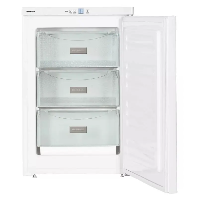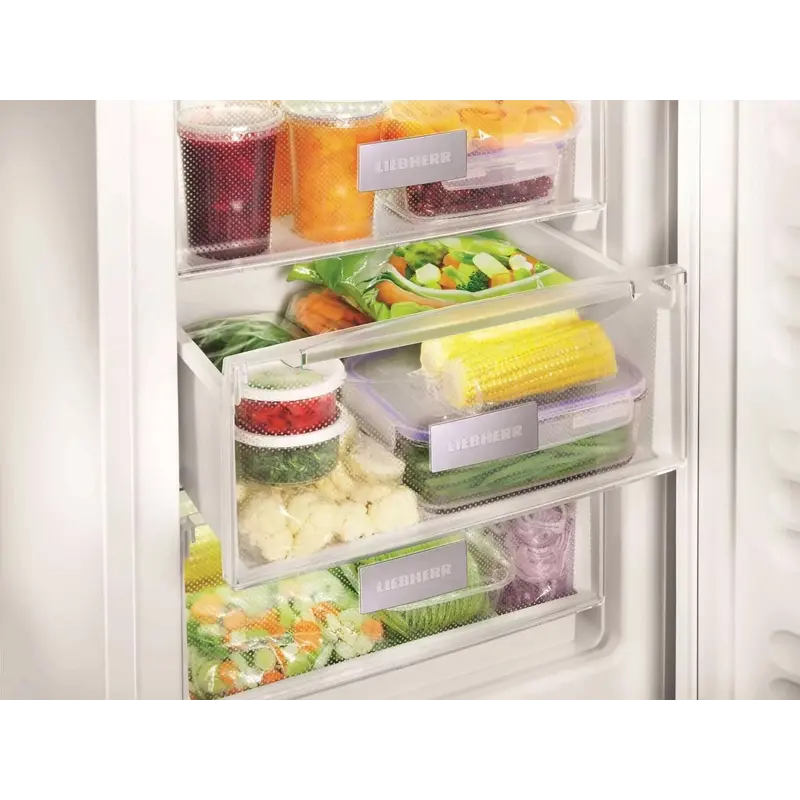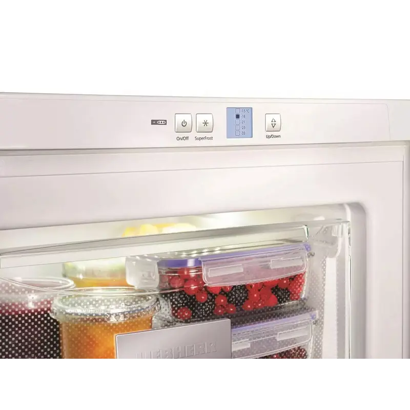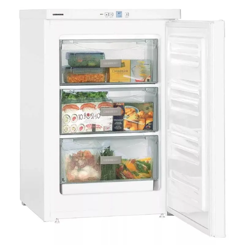 Морозильник Liebherr G 1213 - ідеальний вибір для тих, хто вважає за краще довгий час зберігати запаси продуктів. Завдяки сучасним інноваційним системам заморозки, ця модель дасть вам змогу практично цілий рік харчуватися натуральними, свіжими овочами та фруктами, з яких можна варити корисні компоти, пекти ароматні пироги для всієї родини, нарізати легкі та приголомшливо смачні салати. Електронне, кнопкове управління в Liebherr G 1213 - інтуїтивно-просте і неймовірно чуйне. У користувача не виникне труднощів під час взаємодії пристроєм, що дасть змогу отримувати максимальне задоволення від використання обладнання. Морозильна камера оснащена дисплеєм MagicEye, яка виводить всі важливі показники на LED-дисплей. Дана модель відноситься до класу Comfort і являє собою ідеальне співвідношення ціни і якості. Зовнішній вигляд. Об'єм камери G 1213 становить 98 літрів, а розміри пристрою - максимально оптимальні і становлять 85.1х55.3х61 см. Завдяки своїй компактності морозильник можна без зусиль розмістити на кухні будь-якого формату. Конструктивні можливості дають змогу розташувати окремостоячий Liebherr G 1213 впритул до стіни або помістити в нішу. Цю камеру оснащено звуковим і оптичним сигналами, які своєчасно сповістять вас про несправності в роботі приладу і забезпечать 100% збереження свіжості та корисних властивостей продуктів. Білий колір, у якому виконано виріб, дасть йому змогу гармонійно вписатися в кухню з будь-яким інтер'єром. Інноваційні технології. MagicEye. Спеціальний дисплей на корпусі пристрою, який дає змогу максимально комфортно керувати вашим пристроєм і його функціями. Ця панель керування відображає необхідну інформацію про роботу холодильника. Тепер ви зможете змінити параметри в будь-який момент всього декількома дотиками пальців. SuperFrost. Разом з Liebherr G 1213 ви зможете практично забути про трудомісткий процес розморожування. Завдяки системі SmartFrost, потреба в розморожуванні пристрою знижується практично до мінімуму: достатньо всього одного-двох разів на рік. А за допомогою технології SuperFrost ви зможете в найкоротші терміни заморозити велику кількість різноманітних продуктів за температури -32°C. SmartFrost. SmartFrost - інновація, з якою ви забудете про іній на стінках холодильника та продуктах. Скорочення утворення інею вдалося досягти завдяки випарнику, який винесено за межі корпусу морозильної камери. VarioSpace. З цього моменту немає сенсу турбуватися про розподіл продуктів у морозильній камері. Унікальна технологія VarioSpace дає змогу здійснювати регулювання корисного об'єму, за допомогою можливості висувати ящики. Тепер навіть красивий, високий торт з легкістю можна розмістити у вашому морозильнику, не зіпсувавши його форму. З VarioSpace так просто регулювати простір. FrostProtect. Система для ефективної роботи пристрою за температури навколишнього повітря не нижче -15 °C. Це дає змогу використання техніки в неопалюваних приміщеннях. Можна встановлювати на закритій веранді, заскленому балконі або в підвалі. FrostSafe. Висувні, прозорі контейнери для зберігання продуктів виготовляються з екологічно чистого пластику. Високі стінки контейнерів при відкритті дверцят зводять потрапляння теплого повітря до мінімуму. FrostSafe - це надійний захист заморожених продуктів у камері. Обладнання Liebherr - це задоволення від процесу взаємодії з технікою високої якості за доступними цінам