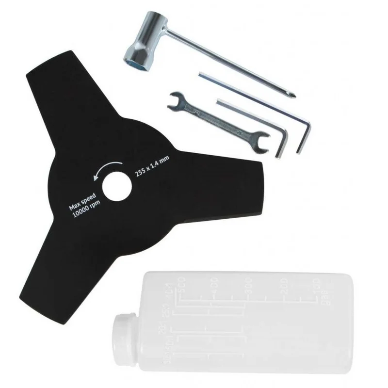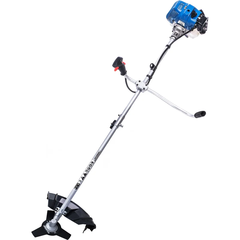 Опис В якості ріжучого елементу можна використовувати волосінь або ніж. Коса оснащена надійним двигуном, системою легкого запуску Easy start, системою гасіння вібрації, велосипедною рукояткою, редуктором зі зниженим рівнем шуму. Розбірний вал дозволяє компактно скласти інструмент для його зберігання. Захисний кожух забезпечить безпеку оператора під час роботи. Наявність наплечного ременя сприяє розподілу навантаження між руками і спиною користувача. Особливості: Редуктор зі зниженим рівнем шуму; Спрощена система запуску, поршень з двома кільцями; Напівавтоматична подача волосіні; Велосипедна рукоятка; Ранцевий ремінь через плече;