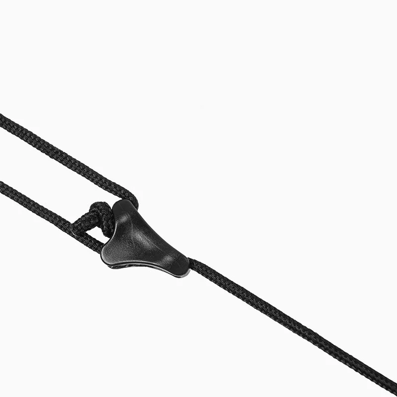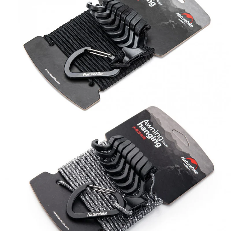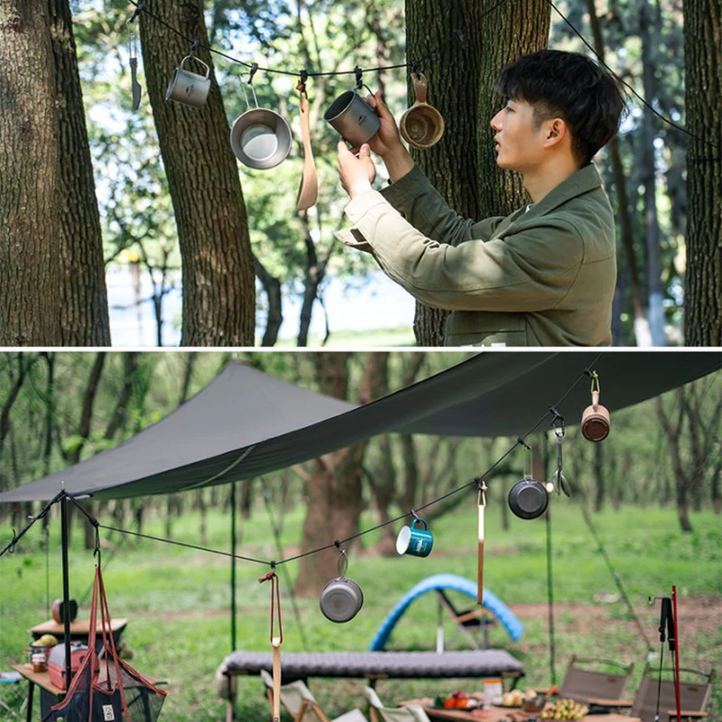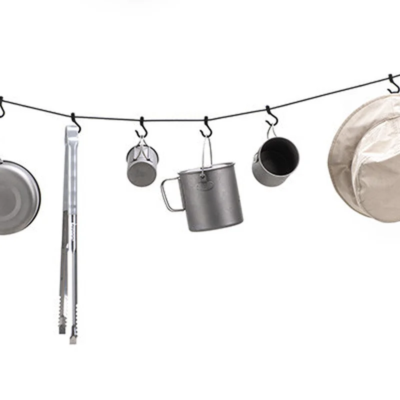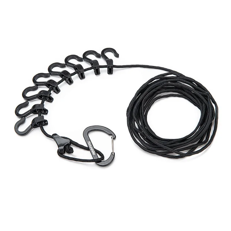 Мотузка призначена для підвішування різних дрібних предметів, які можуть вам стати в нагоді під час перебування на природі. У складі виробу - такі матеріали, як поліестер, нейлон, сплав алюмінію. Колір-темно-сірий. Довжина досягає 430 сантиметрів. На мотузці, наприклад, можна зафіксувати всілякі кухонні прилади, посуд, чашки. На мотузку кріпляться гачки, які дозволяють підвішувати необхідні речі. Довжина виробу регулюється.
