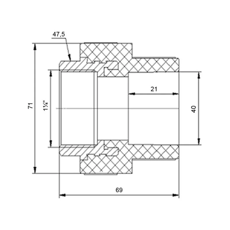 Шестигранна муфта PPR Blue Ocean 40х1" 1/4 ВР виконана з поліпропілену з внутрішньою трубною різьбою з латуні діаметром 1" 1/4 і шестигранною ділянкою під гайковий ключ. Зі зворотного боку передбачений вихід з діаметром 40 мм для підключення до поліпропіленової труби методом поліфузного зварювання. Матеріал виробу швидко плавиться та не прилипає до насадок паяльника. Крім цього, гарантує герметичність та повітронепроникність з‘єднання.
