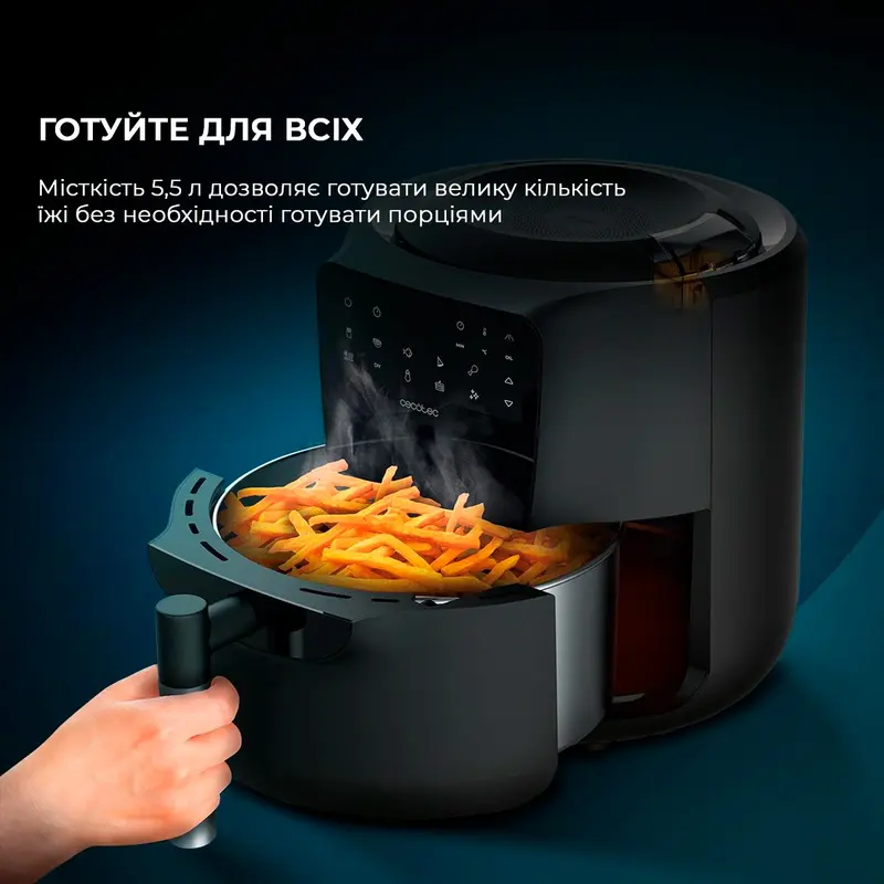 Сучасна та потужна мультипіч Сучасна та потужна мультипіч CECOTEC Cecofry Rain Acc Kit створена спеціально для максимально швидкого та легкого приготування будь-яких ваших страв. За допомогою ємності для приготування об'ємом 5.5 л і багатофункціональної сенсорної панелі з великою різноманітністю режимів приготування робить ваші страви неймовірно смачними при цьому за короткий час. Особливості: Вбудована автодозування олії Технологія Custom Crispy 8 вбудованих функція приготування страв Електронний таймер від 0.5 до 24 годин Багатофункціональна сенсорна панель Висока потужність виготовлення 1500 Вт Функція MultiCook Автодозування олії Додайте олію в спеціальну ємність і забудьте про постійне доливання, оскільки мультипіч CECOTEC Cecofry безпосередньо додасть необхідну олію в кожний рецепт за допомогою 7 рівнів дозування для досягнення ідеальних смакових якостей ваших страв. Легке та розумне готування Готуйте за будь-яким рецептом, не турбуючись і не побоюючись помилитися, завдяки автоматичному дозатору, який запрограмований на розпилення більшої чи меншої кількості олії в залежності від вибраного рецепту за допомогою попередніх налаштувань в електронному меню. Мультикухар Готуйте один і той же рецепт декількома способами і вибирайте правильну температуру, час і рівень олії, щоб максимально комфортно досягти бажаного смаку будь-якої вашої страви. Приготування для великої компанії Мультипіч CECOTEC Cecofry має ємність 5.5 л, що дозволяє готувати великі порції без необхідності робити це партіями. Велика потужність для приготування Велика потужність для приготування в 1550 Вт ідеально підходить для соковитих і хрустких страв, крім того, мультипіч CECOTEC Cecofry включає таймер від 0.5 до 24 годин, ви можете запрограмувати аерофрітюрницю на початок приготування страв в потрібний вам час. Легке та точне управління Автоматично вибирайте рівень та кількість розпилення, час та температуру, щоб ваші рецепти були максимально соковитими та смачними. Попереднє нагрівання Функція попереднього нагріву для досягнення ідеального результату кожної страви дозволить заздалегідь розігріти мультипіч та максимально ефективно готувати будь-які страви. Багатофункціональна сенсорна панель Контролюйте усі свої приготування за допомогою сенсорного дисплея, який дозволить вам повністю налаштувати мультипіч під будь-який рецепт та готувати максимально комфортно.