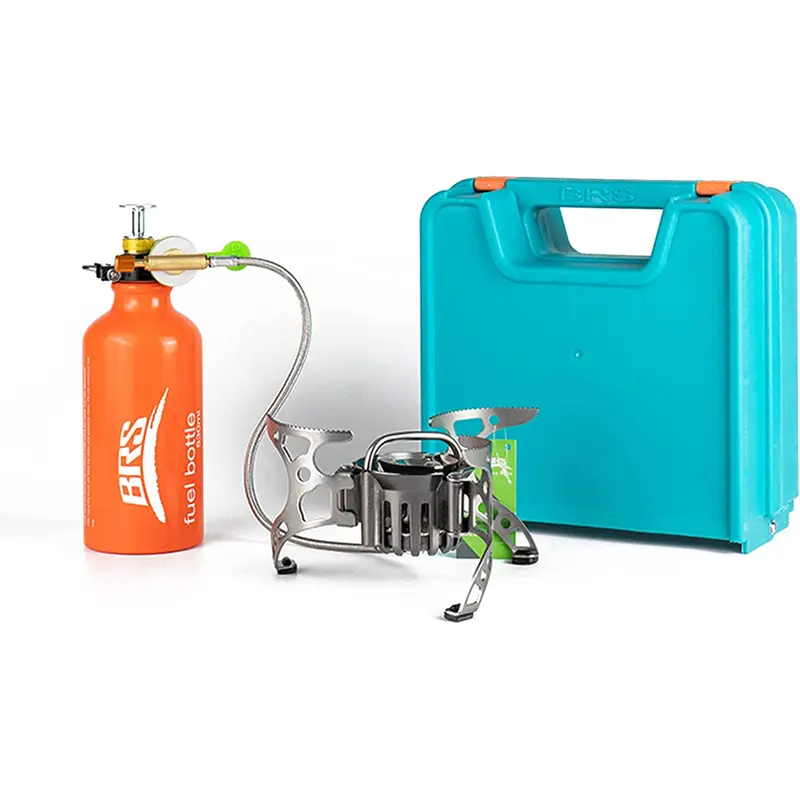 До комплекту з пальником також входить алюмінієвий насос, силумінова помпа, паливний балон на 450 мілілітрів, шланг довжиною близько 270 міліметрів. Всі предмети компактно складаються у фірмову валізу яскравого блакитного кольору, всередині якої для кожної деталі відведено своє місце. Це не тільки дозволяє зручно переносити набір, але також запобігає появі подряпин на металевій поверхні аксесуарів, що часто відбувається у разі тертя предметів один об одний при транспортуванні. Вага BRS-8A складає 501 грам.