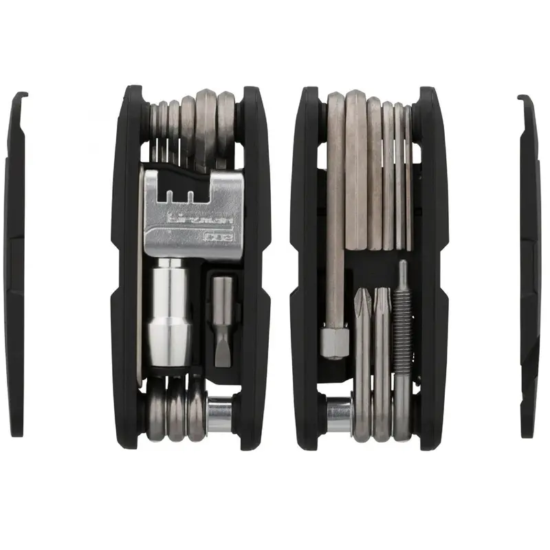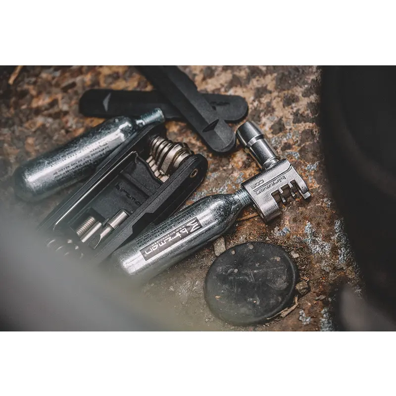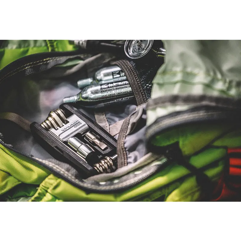 Для того, чтобы затянуть болты, отремонтировать цепи или заменить камеру, а также заправиться с помощью CO2, вы можете использовать входящие в набор шестигранники на 2, 2.5, 3, 4, 5, 6 и 8 мм, «звёздочку» Torx T25, крестовую и плоскую отвёртки, экстрактор с цепными заклёпками, ключи на 3,2 и 3,4, цепной хомут, комплект бортировочных лопаток, и головку клапана СО2, совместимую с резьбовыми картриджами с сжатым воздухом.