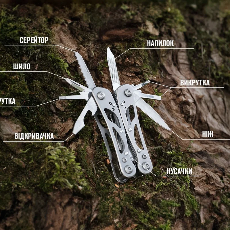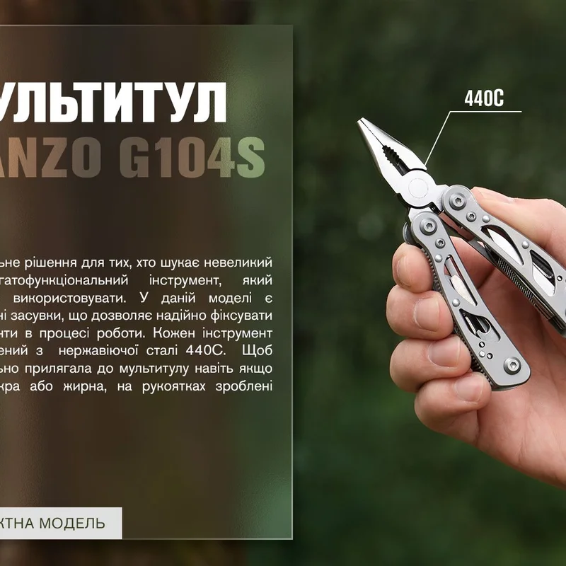 Новинка від компанії Ganzo – складаний мультитул G104 S. Модель G104 S відрізняється компактними розмірами і невеликою масою. Оптимальний набір інструментів дозволяє виконати більшість робіт, які можуть знадобитися в міських умовах. В комплект мультитула G104 S входять наступні інструменти: підпружинені плоскогубці з кусачками, два леза, одне з яких має серейторне заточування, дві плоских і одна хрестоподібна викрутка середнього розміру, шило, невеликий напилок, паз для зняття ізоляції з проводів, відкривачка для пляшок і консервний ніж. Всі інструменти виготовлені з високоякісної сталі 440С, яка має високі експлуатаційні характеристики.
