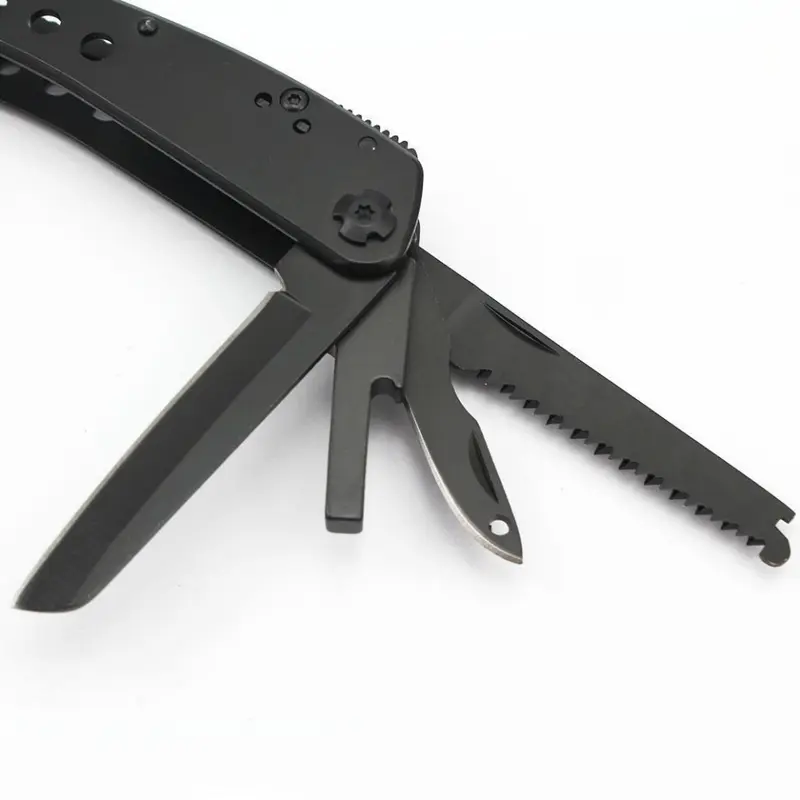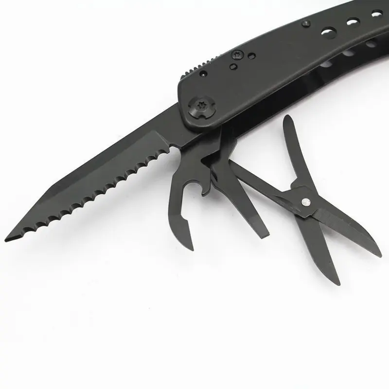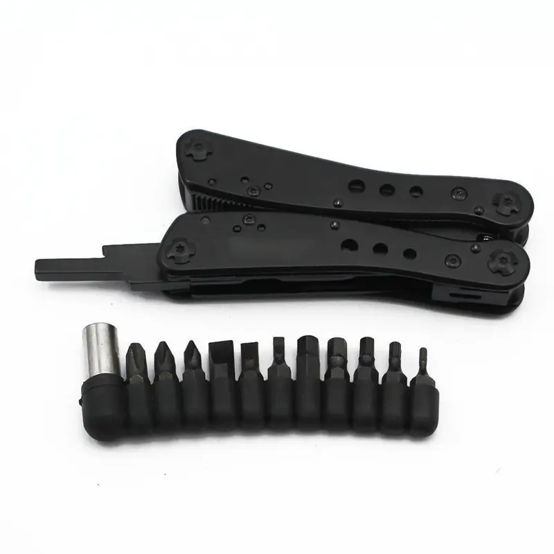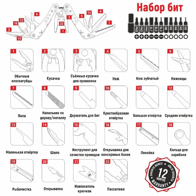 Количество функций: плоскогубці, кусачки, маленька викрутка плоска, ніж, серрейтор, консервний ніж, відкривачка для пляшок, для зняття ізоляції, пила, захоплення для гайок і циліндрів, ножиці, шило, тримач біт, 12 змінних насадок в комплекті