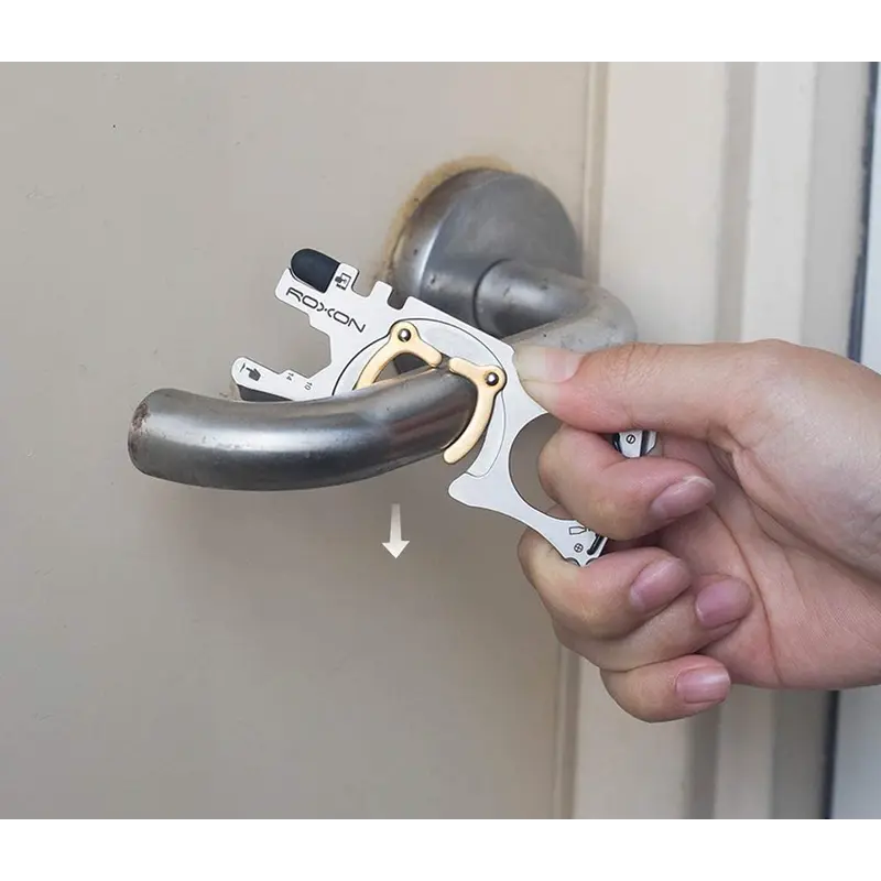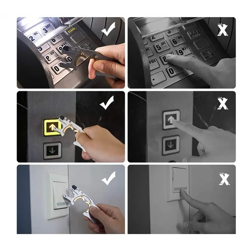 Дверний гачок виготовлений з натурального антибактеріального мідного матеріалу, дієвого проти бактерій і вірусів. Мультитул сприяє міцному захопленню та утриманню дверної ручки, без ковзання, забезпечуючи безпеку. Натисніть, щоб відкрити двері. Точно так само просто, не побоюючись бактерій, можна йти виносити сміття, йти в супермаркет і виконувати інші дії. Можна навіть натискати на кнопки ліфтів або користуватися банкоматом, – все це праці не складі. Словом, мульті інструмент Roxon Spirit S705 дозволяє легко виконувати всі ті, що ви зазвичай робите за допомогою пальців своїх рук. Альо при цьому – без ризику зараження.