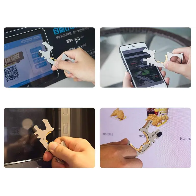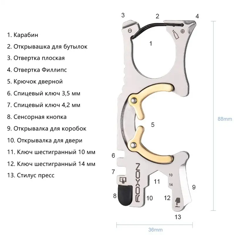 Мульті інструмент надзвичайно дієвий і функціональний, з його допомогою вдається робити багато операцій. Відкривати пляшки, розкривати коробки, щось підкручувати, повертати, а також багато що інше – легко при використанні моделі. Вона зроблена акуратною і надійною, має міцну структуру, розрахована на довгий термін застосування. Рівний контур без задирок. Ергономічна ручка. Конструкція дуги забезпечує комфортний захоплення. Задня частина має кільцеву конструкцію, що добре для стабільного зчеплення пальців і зручного використання.