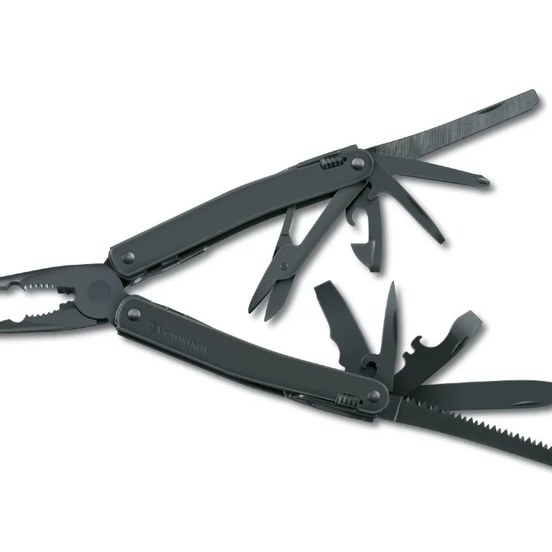 В компактну конструкцію виробу включені інструменти, призначені для особистої гігієни (пилочка для нігтів, скребок), а також безліч пристосувань побутового призначення (консервний ніж, хрестова викрутка, плоскогубці, шило, лінійки різних розмірів і т. д.). З появою Victorinox Swisstool поняття про можливу багатофункціональності складного ножа істотно розширилося. Представлена модель стане оптимальним рішенням для тих, кому раніше не вистачало деяких опцій в комплектації улюбленого портативного аксесуара. Зручність та легкість експлуатації, а також безпеку використання гарантується особливим механізмом, з вбудованим замком U-lock. Традиційним для швейцарського ножа Victorinox, матеріалом виготовлення виробу послужила нержавіюча сталь високої якості, стійка до широкого ряду руйнівних факторів, серед яких: негативний вплив вологи, згинання і деформація інструментів, внаслідок механічного впливу. Функціональна насиченість Викторинокс Свизтул гармонійно збалансована стриманим дизайном. Оформлення корпусу, як і самих окремих інструментів, представлено чорним матовим покриттям, яке, в силу застосування інноваційних технологій, відрізняється високою практичністю і зносостійкістю. Приємним сюрпризом для покупців представленої моделі ножі Victorinox стане наявність таких унікальних інструментів, як пила і напилок по металу, інструмент для зняття ізоляції, пристрій для перекушування твердої дроту, щипці для виконання робіт з електричними проводами. Для багатьох користувачів ці інструменти можуть виявитися справжньою знахідкою! Багатофункціональний інструмент володіє особливим типом клинка – Drop Point. Ножі такого роду широко затребувані серед людей, що активно займаються туризмом. Мультитул Victorinox Swisstool важить всього 208 гр. і не вимагає багато місця для зберігання.