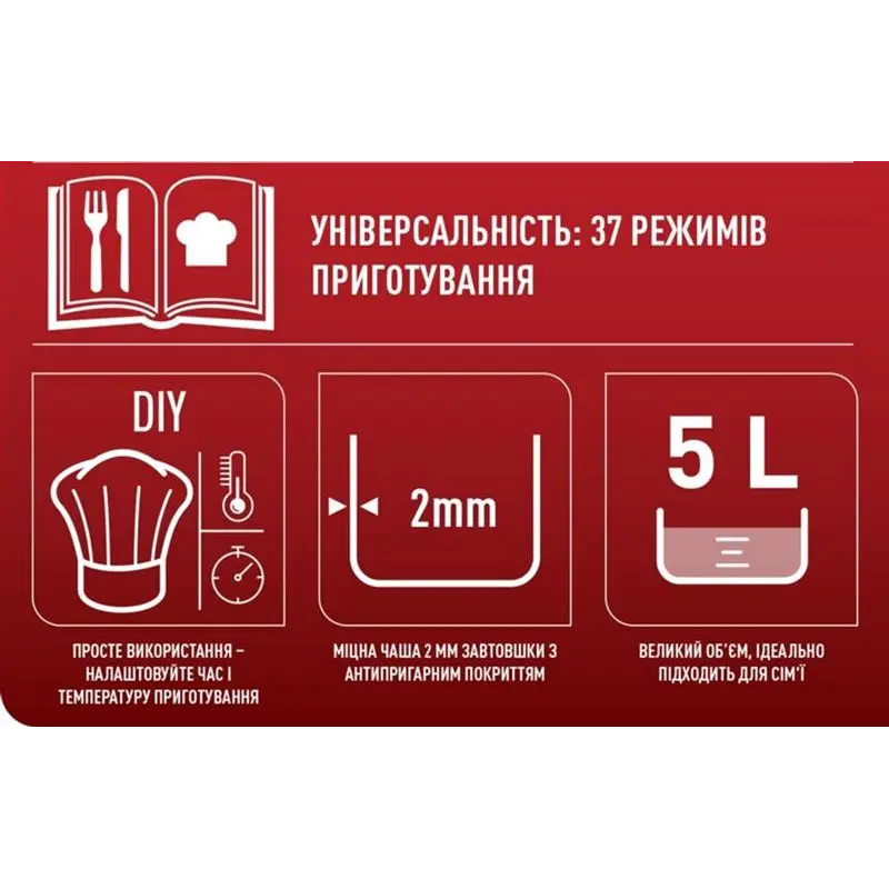 15 автоматичних програм приготування: запікання, суп, пар, рис, йогурт, випікання, розігрівання, плов/ризотто, каша, смаження, паста, варення, ручний режим, підігрів. Включає 37 режимів приготування для більшої гнучкості. Зручно: включає в себе функцію відкладеного запуску для попереднього налаштування приготування до 24 годин. Велика ємність: 5 л (10 чашок), ідеально підходить для сім'ї. Легко використовувати. Електронна LED-панель керування. Готує без нагляду і автоматично зберігає тепло в кінці процесу приготування (до 12 годин). Легко чистити. Знімна чаша з антипригарним покриттям. Аксесуари та знімний паровий клапан безпечно мити в посудомийній машині. Аксесуари в комплекті: кошик для приготування на пару, мірний стакан, ложка для рису. Книга рецептів із 50 рецептами (мови: російська/українська).