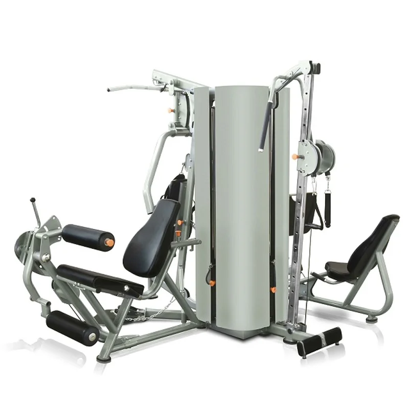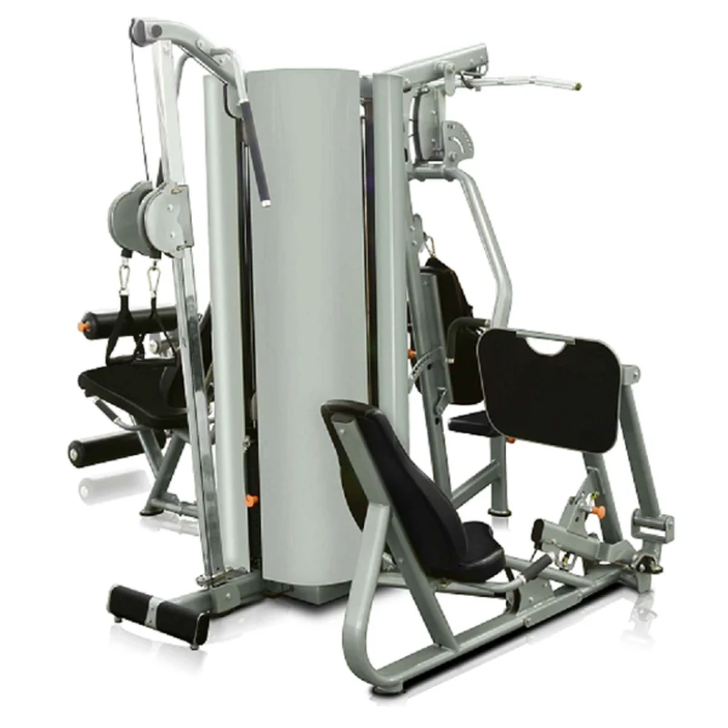 Профессиональный тренажер - 4-х позиционная мультифункциональная станция. Идеальное решение для фитнес-залов гостиниц. Сочетает в себе четыре тренажера: верхняя тяга, гребная тяга, разгибание ног, жим ногами. Позволяет выполнять упражнения для мышц груди, плеч и рук, мышц пресса, верхнюю тягу, гребную тягу, упражнения на трицепс, на мышцы ног и бедер.