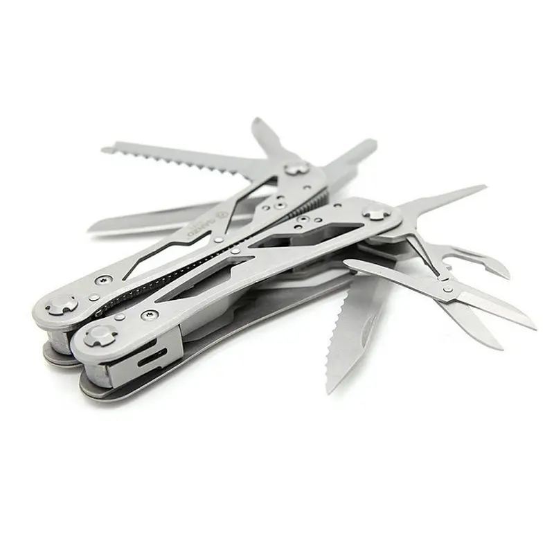 У комплект входять наступні предмети: підпружинені плоскогубці з кусачками, два леза, одне з яких має серейторну заточку, плоска викрутка невеликого розміру, ножиці, ножівка по дереву, зенкування, подовжувач адаптера для біт відкривачки для пляшок і консервів.