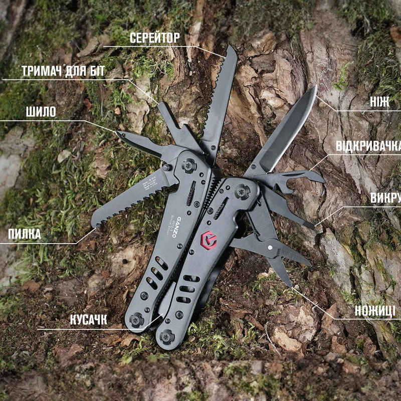 Зручний повнорозмірний мультитул G302-від компанії Ganzo. Великий набір інструментів дозволяє використовувати модель G302-В для повноцінного ремонту різноманітної техніки. В комплект мультитула G301-В входять наступні інструменти: підпружинені плоскогубці з кусачками, два леза, одне з яких має серейторну заточку, дві плоских викрутки різного розміру, пилу по дереву, ножиці і ін