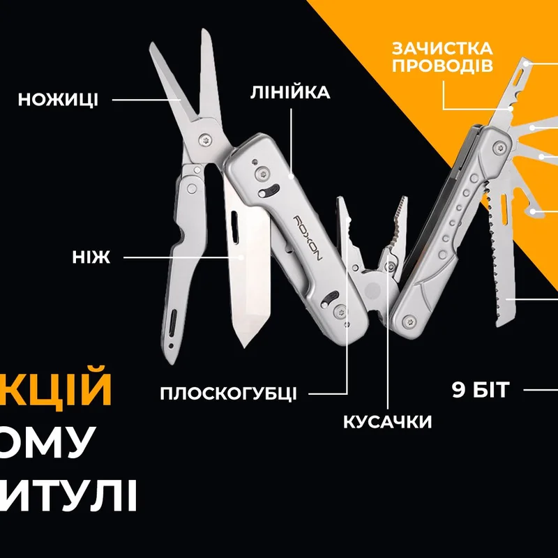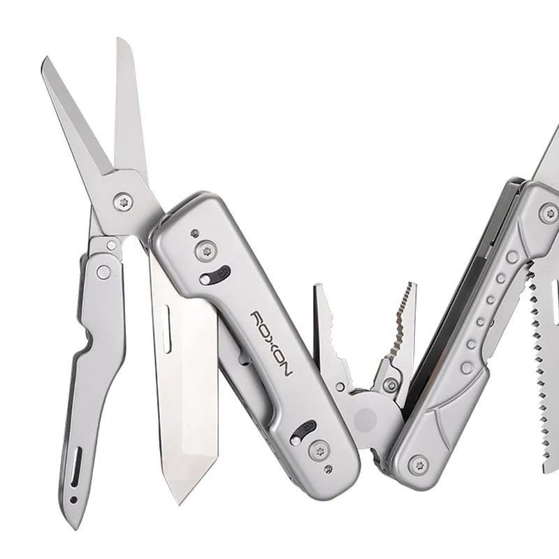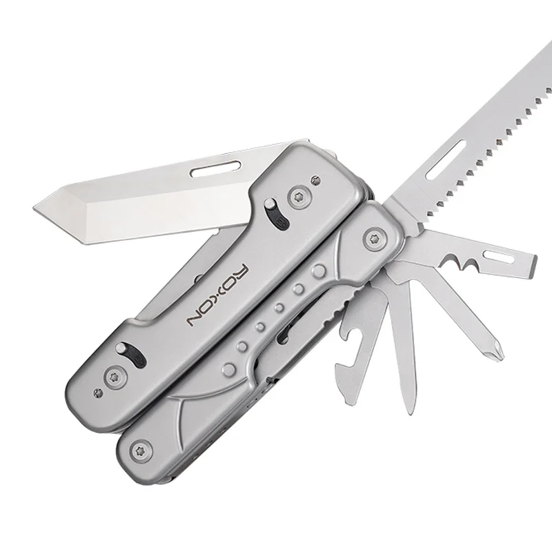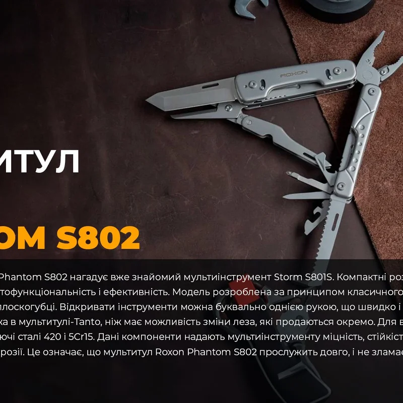 Модель мультитула Roxon Phantom S802 нагадує вже знайомий мульті інструмент Storm S801S. Компактні розміри, надзвичайно зручне використання, багатофункціональність і ефективність. Модель розроблена за принципом класичного мультиинструмента, основні пристосування – плоскогубці. Тут 15 функцій для виконання різних видів робіт на практиці.