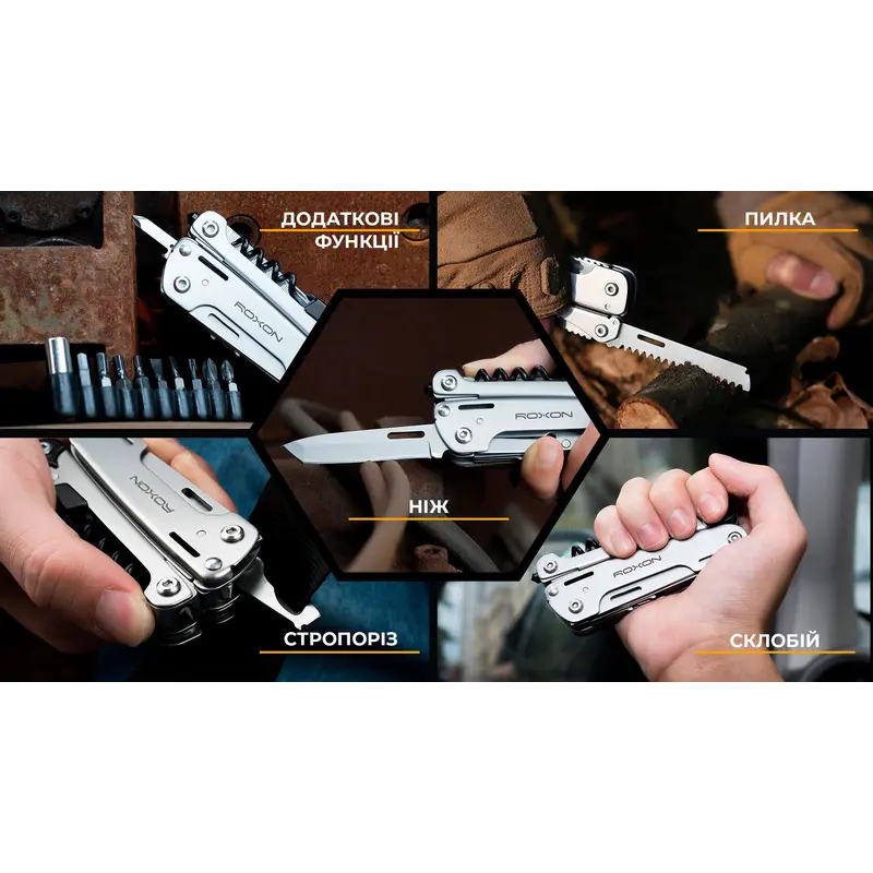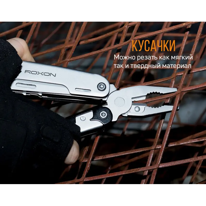 Модель Roxon STORM S801S створена за принципом класичних мультитула. Роль головного інструменту в ньому виконують плоскогубці. Вони додатково оснащені захопленням для круглих предметів і функцією кусачок. Всі інші інструменти розміщуються всередині двох металевих ручок. В тому числі, користувачам доступні пила, невеликий напилок, край якого використовується як пряма викрутка, відкривачка і штопор, склобій. Всі перераховані інструменти знаходяться в одній рукоятці, а в іншій розміщені ніж з гладко заточеним лезом, стропоріз, консервний ніж, шило, посилені ножиці, лінійка, тримач для біт, який виступає також у якості хрестоподібної викрутки.
