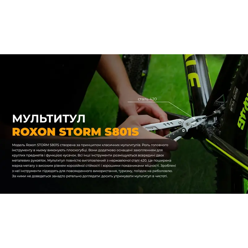 Roxon STORM S801S повністю виготовлений з нержавіючої сталі 420. Це поширена марка металу з високим рівнем корозійної стійкості і хорошими показниками міцності. Зроблені з неї інструменти підходять для повсякденного використання, подорожей, поїздок на риболовлю. За ними не доведеться дуже ретельно доглядати: досить містити мультитул у чистоті.