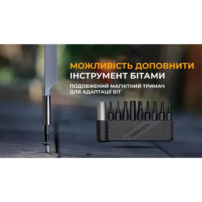 Ще більше функціональність Roxon STORM S801S розширюється за рахунок набору біт і перехідника для них. Це, свого роду, комплект компактніх викруток різної форми, з допомогою яких можна відкрутити будь гвинт. Всі біти зберігаються в одному чохлі, що не дозволяє їм загубитися. Набір біт, як і сам мультитул, поміщається в нейлоновий чохол, який продається разом з мультиинструментом. Цей чохол захистить мультитул від бруду і подряпин. Він дуже зносостійкий і легко пертися, коли це потрібно.