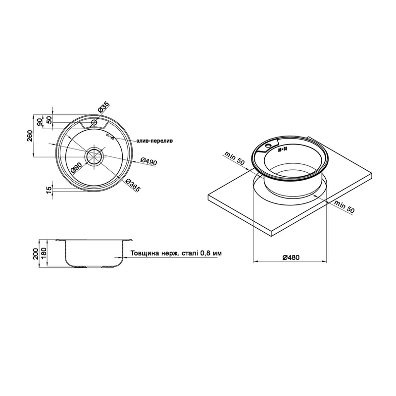 Мийка для кухні з харчової нержавіючої сталі врізна кругла AISI 201 WAL-D490-18-08V