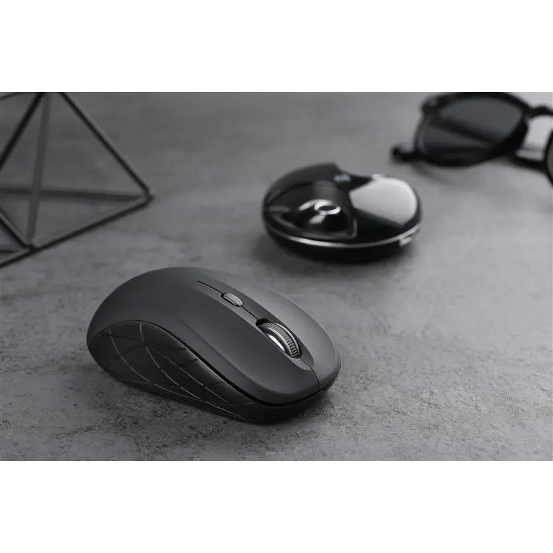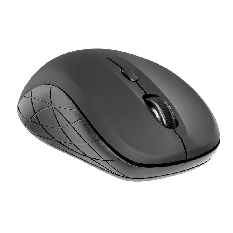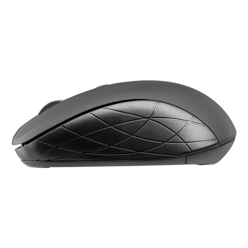 Бездротова ергономічна миша з матового пластика забезпечить комфортну роботу протягом тривалого часу. Виконана в класичному дизайні в чорному кольорі і з геометричними вставками на бічних сторонах миші. Швидкість курсора налаштовується під власні вимоги: 800, 1200 або 1600 DPI.