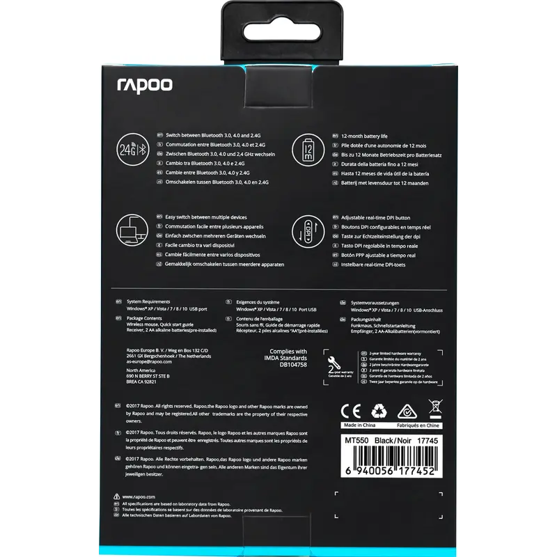 Перемикання між Bluetooth 3.0, 4.0 та комплектним приймачем Розумне перемикання між Bluetooth 3.0, 4.0 та USB-приймачем (2.4 ГГц) дозволяє отримати стійке з'єднання. Ви завжди зможете використовувати мишу, навіть якщо зайняті всі USB порти або втрачено приймач. Підтримка кількох пристроїв Миша MT550 може на льоту перемикатися між пристроями. Вона запам'ятовує налаштування до чотирьох пристроїв і перемикається між ними за необхідності. Це дуже полегшує роботу і залежить від ОС. Зміна чутливості однією кнопкою Ви можете вибрати 4 варіанти чутливості – 600/1000/1300/1600 DPI. Що завжди корисно під час роботи. Автономність 12 місяців Система енергозбереження та перемикач живлення збільшують тривалість роботи до одного року.
