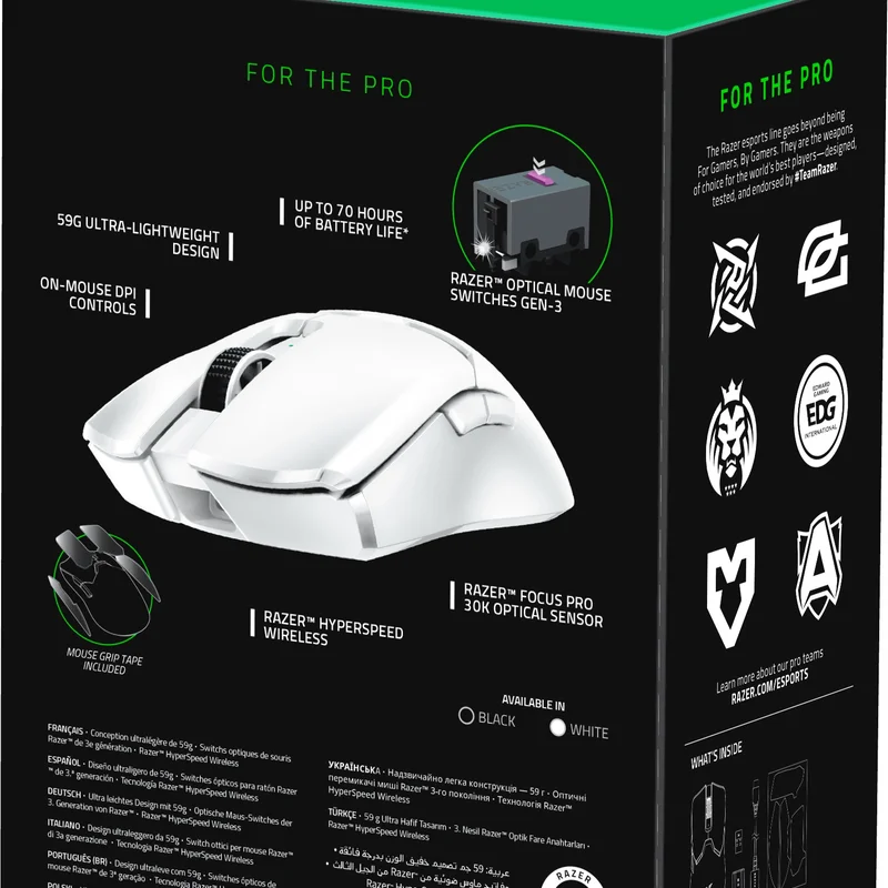 ДЛЯ ПРОФЕСІОНАЛІВ Надлегка, надшвидка бездротова миша для кіберспорту У кіберспорті з’явився новий суперхижак. Ця миша є спадкоємцем удостоєної нагород моделі Razer Viper Ultimate, при цьому новинка практично на 22% легша і оснащена усебічніми покращеннями для підвищення якості гри. Коли у вас одна з найлегших бездротових ігрових мишей в історії, вас ніщо не зупинить. НАДЗВИЧАЙНО ЛЕГКА КОНСТРУКЦІЯ — 58 Г Майже невагома. З новинкою, яка майже на 22% легша за попередницю Razer Viper Ultimate, ви зможете насолоджуватися тим рівнем швидкості та керованості, що цінують топові професійні кіберспортсмени. ОПТИЧНИЙ ДАТЧИК RAZER FOCUS PRO З РОЗДІЛЬНОЮ ЗДАТНІСТЮ 30 K Найкраща в своєму класі точність Новий сенсор Razer забезпечує бездоганне відстеження на різних поверхнях, у тому числі на склі, та доповнений інтелектуальними функціями для поліпшення прицілювання і контролю. ОПТИЧНИЙ ПЕРЕМИКАЧ МИШІ RAZER 3-ГО ПОКОЛІННЯ Без подвійних натискань. Без затримки на придушення брязкоту клавіш. Ця миша має кіберспортивну надійність та швидкість: від збільшеного ресурсу в 90 мільйонів натискань без неприємних подвійних клацань до блискавично швидкого спрацьовування в 0,2 мс без затримок для пригнічення брязкоту контактів. ТЕХНОЛОГІЯ RAZER HYPERSPEED WIRELESS Працює на 25% швидше за інші технології безпроводового зв’язку Завдяки підключенню на 25% швидше, у порівнянні з усіма іншими бездротовими технологіями, ви отримаєте насолоду від гри з першокласними характеристиками та низькою затримкою сигналу, що зберігаються навіть у «шумному» бездротовому середовищі. ТРИВАЛІСТЬ РОБОТИ ВІД АКУМУЛЯТОРА ДО 80 ГОД. Ніяких простоїв під час гри. Наша надлегка спортивна миша може працювати до 80 годин поспіль завдяки покращеній ефективності бездротового живлення. КЕРУВАННЯ ЧУТЛИВІСТЮ МИШІ Підключіть і грайте. Вона просто працює Ця портативна, надлегка кіберспортивна миша дозволяє перемикатися між п’ятьма значеннями роздільної здатності без будь-якого програмного забезпечення, так що ви завжди будете готові до змагань.