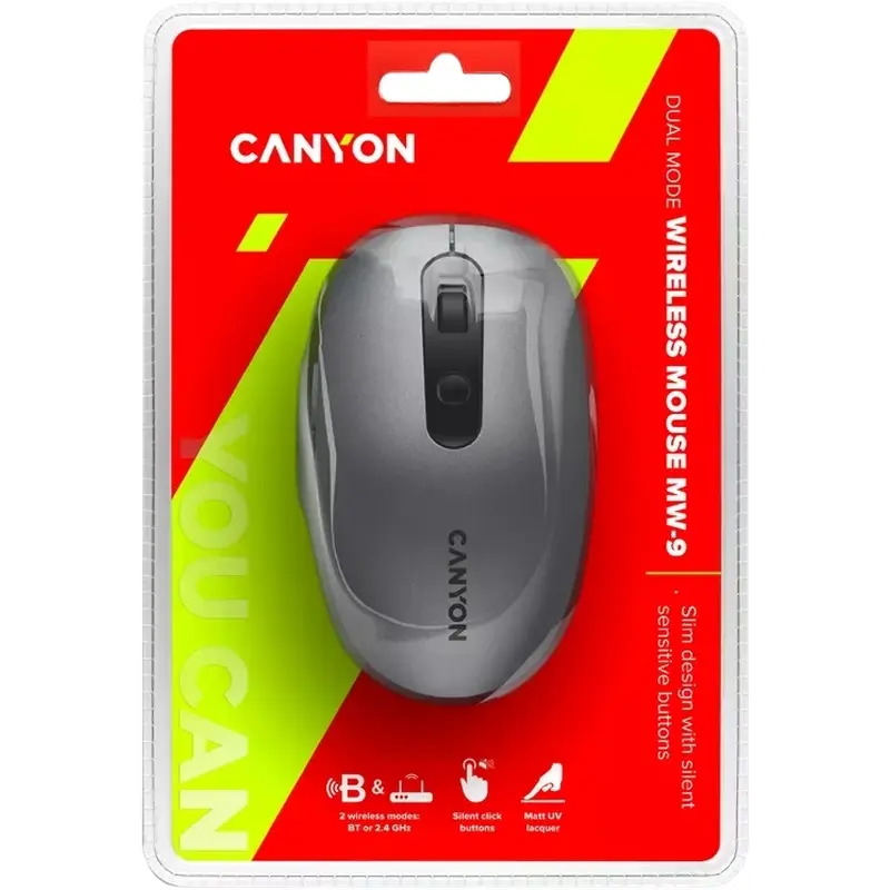 Ця миша створена для того, щоб забезпечувати максимальний комфорт при мінімалістичному дизайні. Портативний розмір, надійне гумове покриття, 6 безшумних довговічних кнопок, економне енергоспоживання і компактний розмір - все це дозволяє використовувати мишу, не побоюючись, що вона відключиться в самий невідповідний момент. Миша працює в двох режимах: 2.4GHz і, якщо ви забули USB-приймач, або хочете звільнити порт, просто використовуйте Bluetooth з"єднання. Оригінальний відтінок "металік", нанесений по технології потрійного покриття, порадує погляд будь-якого цінителя стильних аксесуарів. Сконцентруйтеся на важливому, а мишка Canyon стане надійним помічником в будь-якій робочій ситуації!