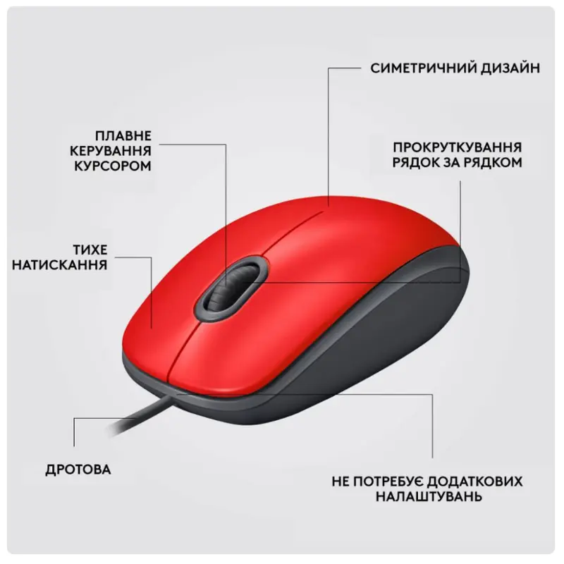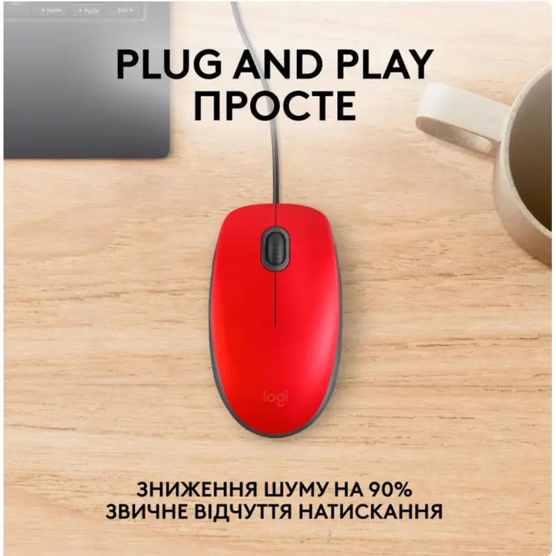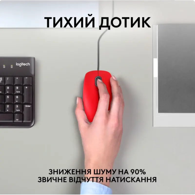 Нумо слухати тишу Виконуйте роботу у звичайному темпі, не заважаючи тим, хто оточує. Завдяки високому рівню шумозаглушення (понад 90%) миші серії Silent забезпечують звичний відгук без звуку клацання. Колесо з плавним прокручуванням також функціонує практично беззвучно. Моделі Silent працюють максимально тихо, нікого не дратуючи та не відвертаючи увагу. Почніть нове життя без набридливих клацань. Ваші колеги й друзі будуть вам вдячні. На 90% менше шуму Завдяки високому рівню шумозаглушення (понад 90%) ця модель гарантує звичний відгук, а звук клацання майже не чути. Порадуйте тишею себе і своїх колег. Крім того, спеціальне гумове коліщатко та нижня панель із високоякісного матеріалу забезпечують безшумне прокручування та плавне ковзання. Налаштування і використання без найменших зусиль Миша повністю готова до роботи. Жодних проблем з встановленням. Жодного програмного забезпечення. Швидке та зручне встановлення — просто під’єднайте кабель до USB-порту та розпочинайте роботу. Зручний повнорозмірний симетричний корпус Повнорозмірний симетричний корпус зручний для тривалої роботи як правою, так і лівою рукою. Вигнута поверхня забезпечує зручне положення пальців і запобігає втомі. Сертифікат Quiet Mark Унікальні миші Logitech першими у світі отримали сертифікат Quiet Mark. Це міжнародний знак якості, який британська асоціація Noise Abatement Society (Товариство із боротьби з шумом) присуджує технологіям зі зниженим рівнем шуму. Створено Logitech Ця модель вирізняється якістю й надійністю, властивими продукції від компанії Logitech — світового лідера у виробництві мишей. Краще, ніж сенсорна панель Все під контролем — завдяки плавному і точному оптичному відстеженню курсор переміщається саме туди, куди вам потрібно. Тепер ви можете редагувати документи та переміщатися вебсторінками ще ефективніше, ніж у разі використання сенсорної панелі.