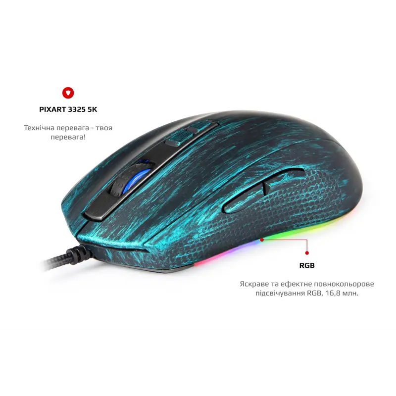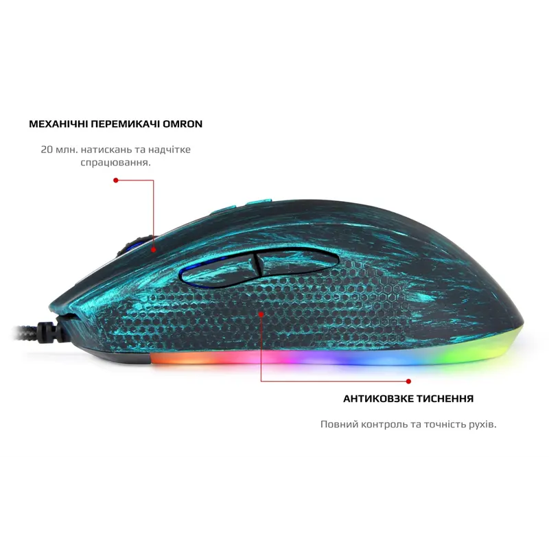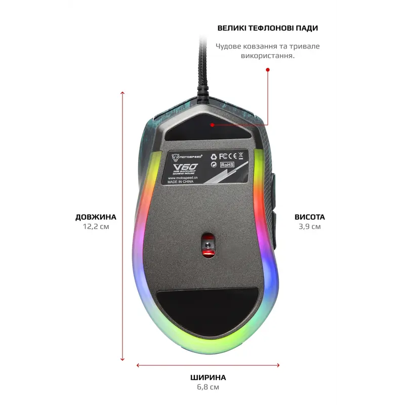 Одна з топових мишей MOTOSPEEDУнікальний та стильний дизайн додасть приємних вражень під час баталій. Неймовірно зручна та потужна миша MOTOSPEED, що надасть перевагу над ворогом.Ідеальний ергономічний дизайн, що гарантує комфортне відчуття та знижує втому. Точна зборка та якісний пластик, відсутність люфтів та надмірних зазорів нададуть задоволення від користування. Програмування надає індивідуальністьМожливість досконало налаштувати мишу під свої потреби за допомогою програми на ПК - режими підсвічування, частота оновлення порту USB, режими DPI, їх кількість, колір індикації та інше.Макроси - запорука перемогиНалаштування на професійному рівні - запис макросів, комбінацій з затримками, перепризначення кнопок, імпорт та експорт профілів.Pixart 3325 5к технічна перевага - твоя перевага! Топовий ігровий сенсор компанії Pixart, точна зброя твоїх майбутніх перемог. Без лагів та помилок, впевнено та надійно. Висока розподільча здатність до 5000 DPIМеханічні мікроперемикачі OMRON, ЯпоніяНеперевершена легендарна Японська якість, надають повний контроль над дійством та надшвидке спрацювання. Надійність, довговічність та точність повторення зусилля натискання один до одного від партії до партії. Чітке та тактильно приємне натискання кнопок без люфтів та надмірних зазорів.RGBЯскраве та ефектне повнокольорове підсвічування RGB, 16,8 млн, з можливістю зміни режимів, що занурить вас у атмосферу гри. Реалізована індикація обраного режиму DPI за допомогою кольору підсвічування логотипу. Тефлонові пади та кабель із застібкоюТовстий тефлон великої площі забезпечить чудове ковзання та тривале використання.М"який та гнучкий високоякісний кабель, гарантує довговічність та зручність використання, а застібка допоможе організувати кабелі на робочому столі та у подорожі.