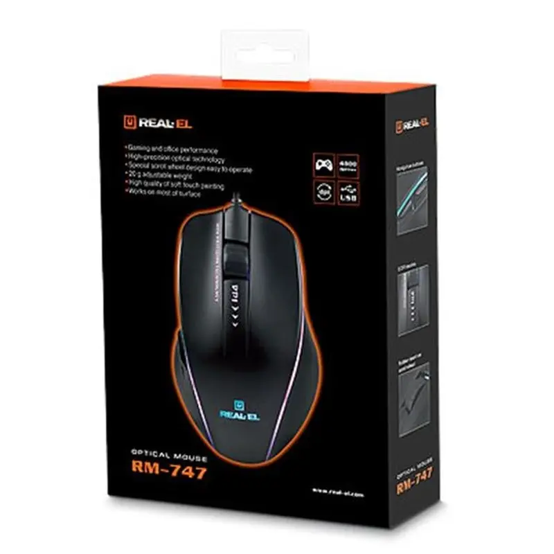 Високоточна оптична технологія дає змогу ігровій оптичній миші REAL-EL RM-747 працювати практично на будь-якій поверхні. Особливості: висока швидкість роботи, 5 + 1 клавіші, коліщатко прокручування, 2 кнопки навігації «вперед» і «назад», перемикач роздільної здатності, вмонтоване підсвічування, регулювання ваги 20 г.