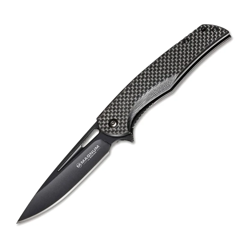 Boker Magnum Black Carbon - складаний ніж для щоденного носіння. Клинок виготовлений з нержавіючої сталі 440А, витягується за допомогою нігтьового зачепа або фліппера і надійно фіксується механізмом лайнерлок. Накладки рукоятки виконані з вуглецевого волокна. Є кишенькова кліпса і отвір під темляк.