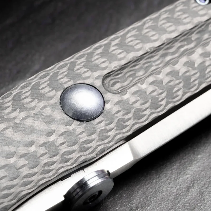 Накладки на руків’я, як і спейсер, виконані з текстурованого вуглецевого волокна, що забезпечує хороше зчеплення навіть з вологою долонею. Лайнер рукояті, знімна кишенькова кліпса tip-up, шайба на обусі та гвинти виготовлені з нержавіючої сталі та анодовані у синій колір, що надає зовнішньому вигляду ножа сучасності.