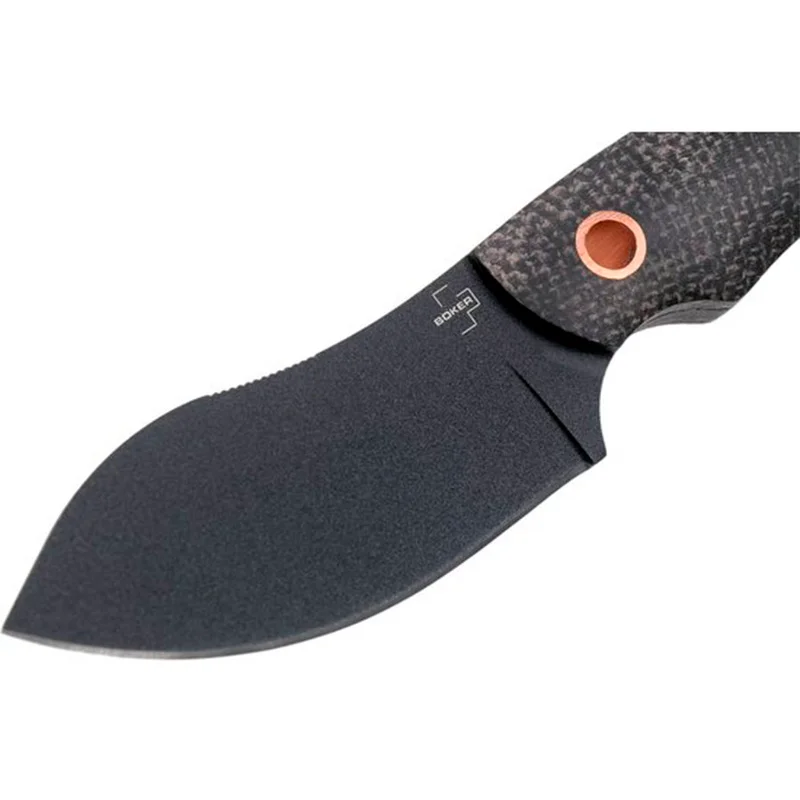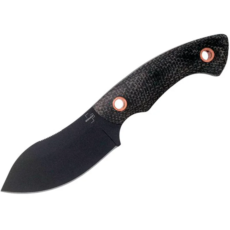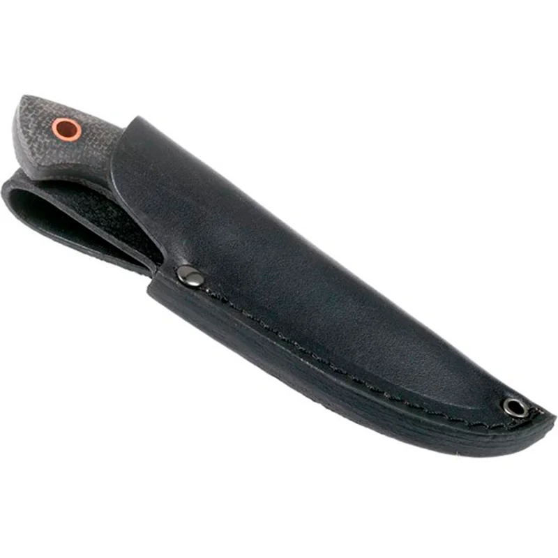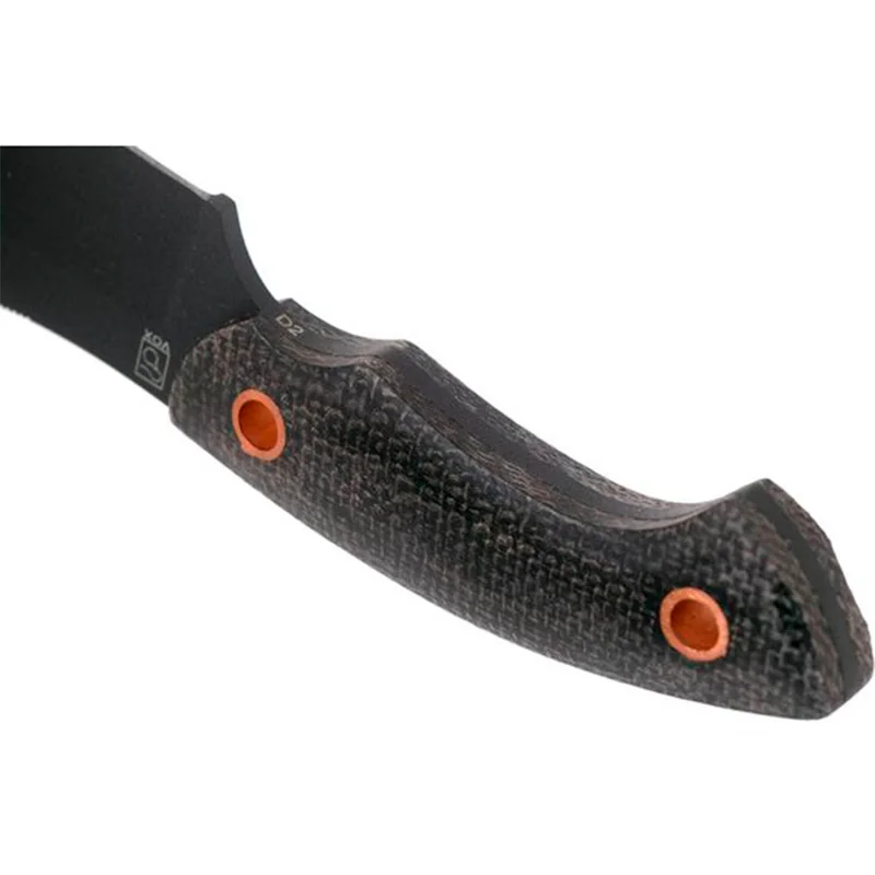 Широкий клинок викований із сталі D2 і має чорне покриття. Природно, ніж побудований за схемою full-tang, накладки на рукояті – з практичної мікарти, а вони кріпляться наскрізними мідними заклепками, з отворами досить широкими, щоб через них можна було простягнути шнур. Ніж поставляється з фірмовими шкіряними піхвами.