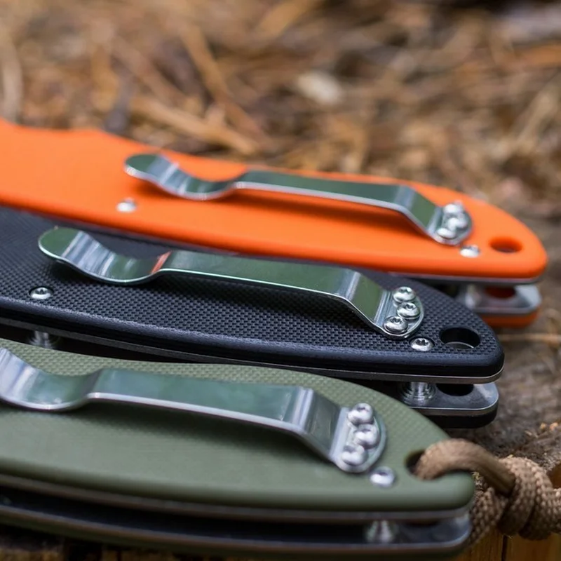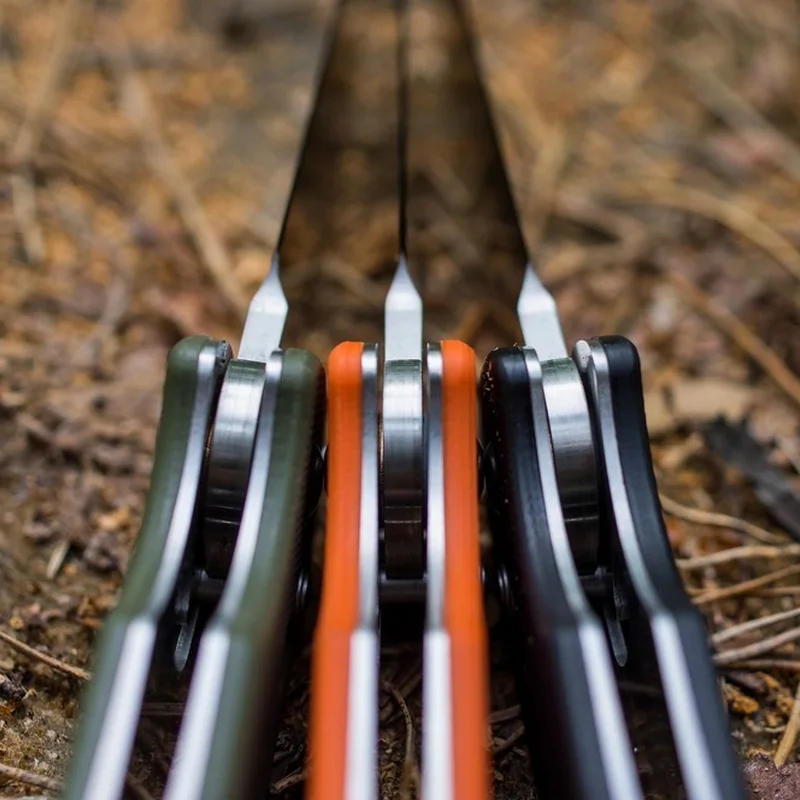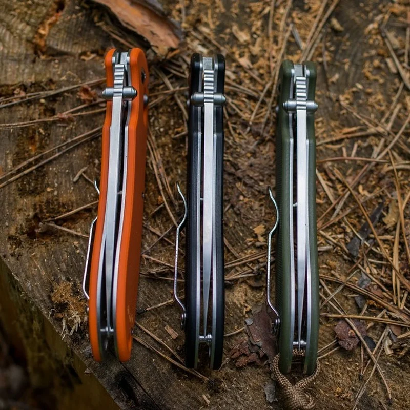 Рукоять ножа отримала дві накладки з надійного склопластику G10. Запасу його міцності повністю достатньо для ножа, який буде використовуватися в мисливських і туристичних цілях. На ручці закріплена сталева кліпса, яка допомагає закріпити ніж на ремені, щоб він не загубився. Додатково передбачена можливість приєднання темляка для страховки на зап'ясті або ж на лямці рюкзака. Колір рукояті в даній моделі може бути чорним, помаранчевим або ж зеленим. Також на рукоятці видно частину замку для фіксації леза. Це механізм конструкції Axis з металевим штифтом. Для відкривання ножа, на лезі розташований невеликий шпеник.