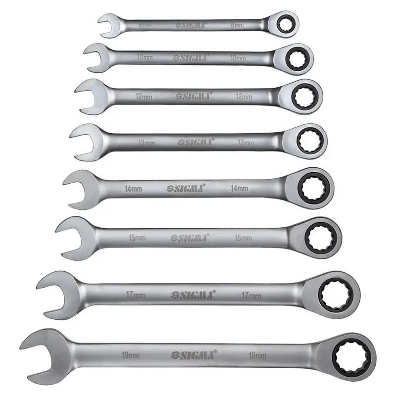 Набір ключів ріжково-накидних з тріскачкою 8шт (8, 10, 12, 13, 14, 15, 17, 19мм) CrV satine SIGMA (6010521)