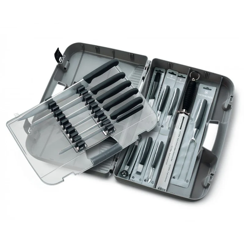 Набір шеф-кухаря складається з 14-ти предметів і невеликого пластикового валізки сірого кольору для їх зберігання. Валіза дозволяє безпечно зберігати Ваші інструменти і в той же час забезпечує легкий доступ до них. Знімна панель, можливість регулювання і розширення набору. Відмінно підібрана комбінація ножів, кожен з яких напевно стане Вашим улюбленим ножем на кухні. Такий ніж не хочеться випускати з рук, працювати з ним - одне задоволення. Ці ножі є ідеальними інструментами для будь-якої професійної кухні.